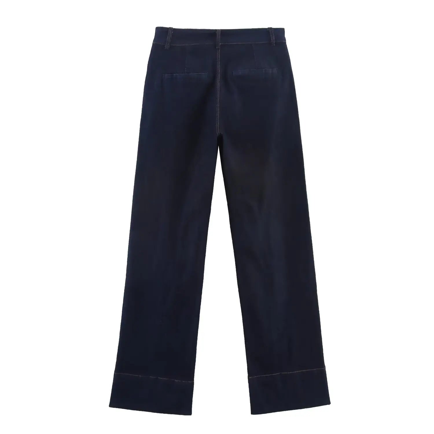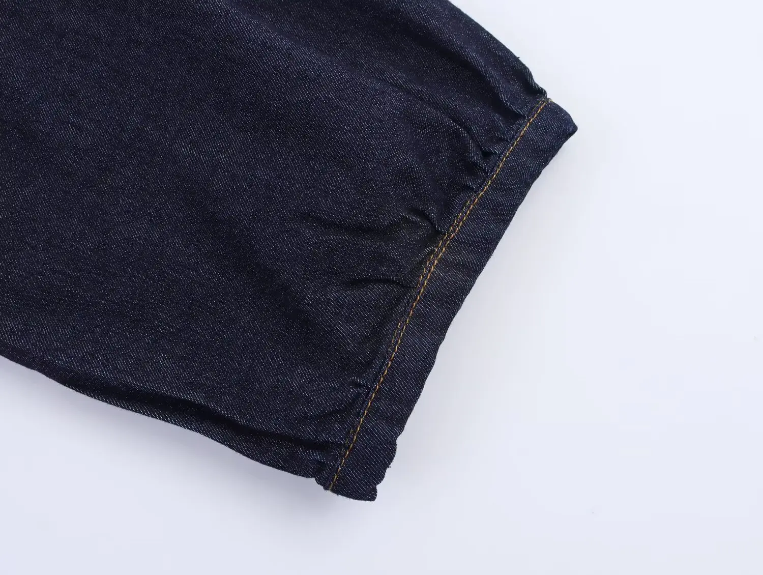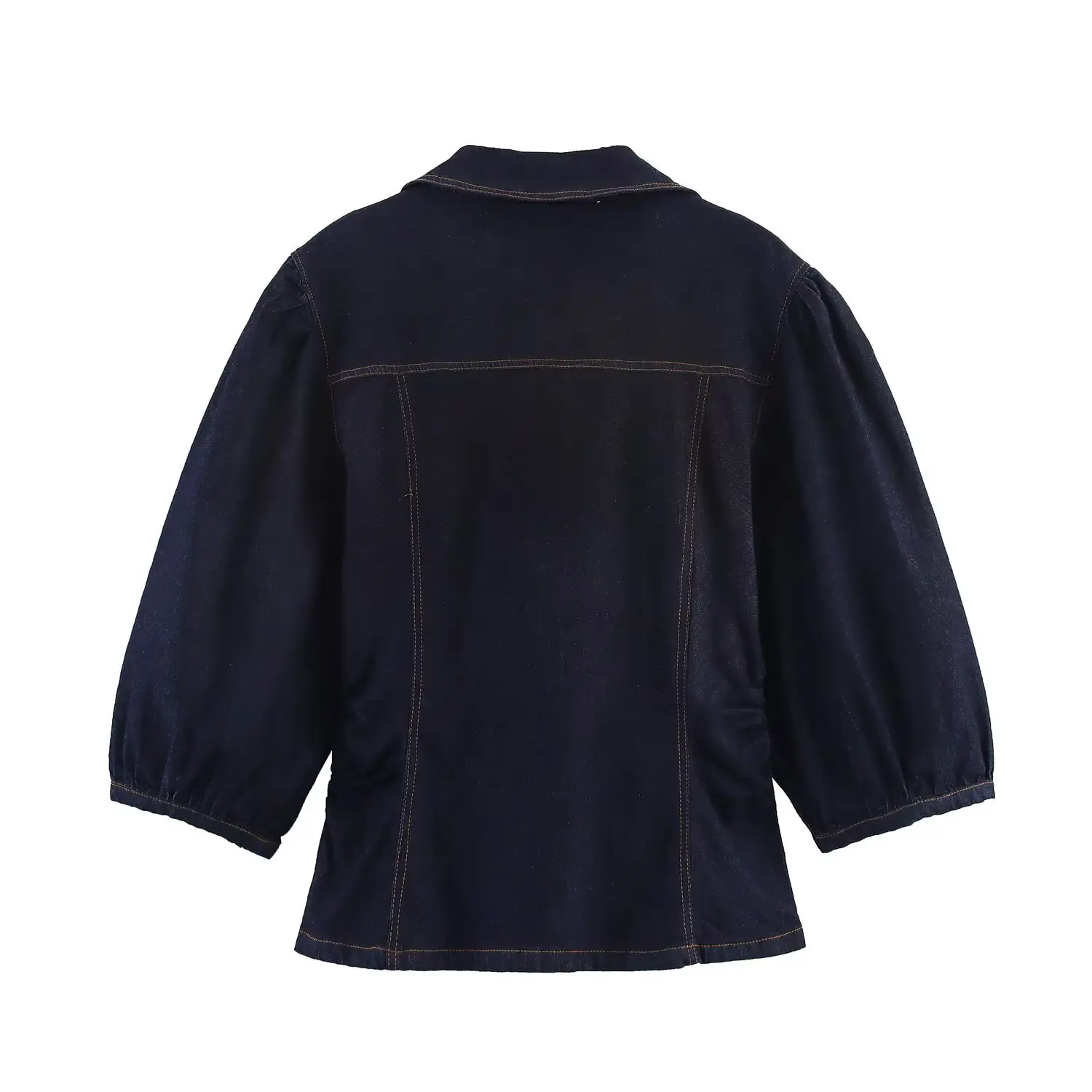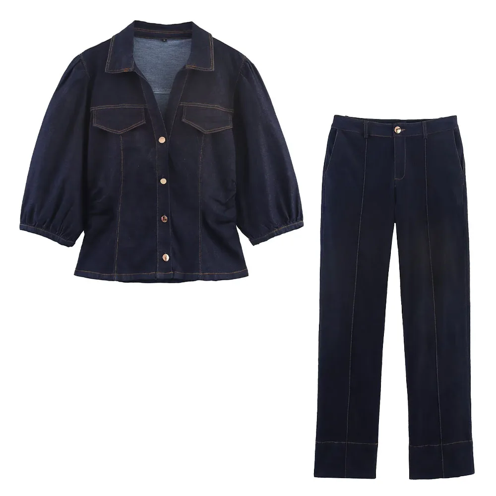 DiYiG Women 2025 Autumn New Fashion Slim Fit Denim Bubble Sleeve Buckle Shirt Zipper Wide Leg Pants Blouses Mujer