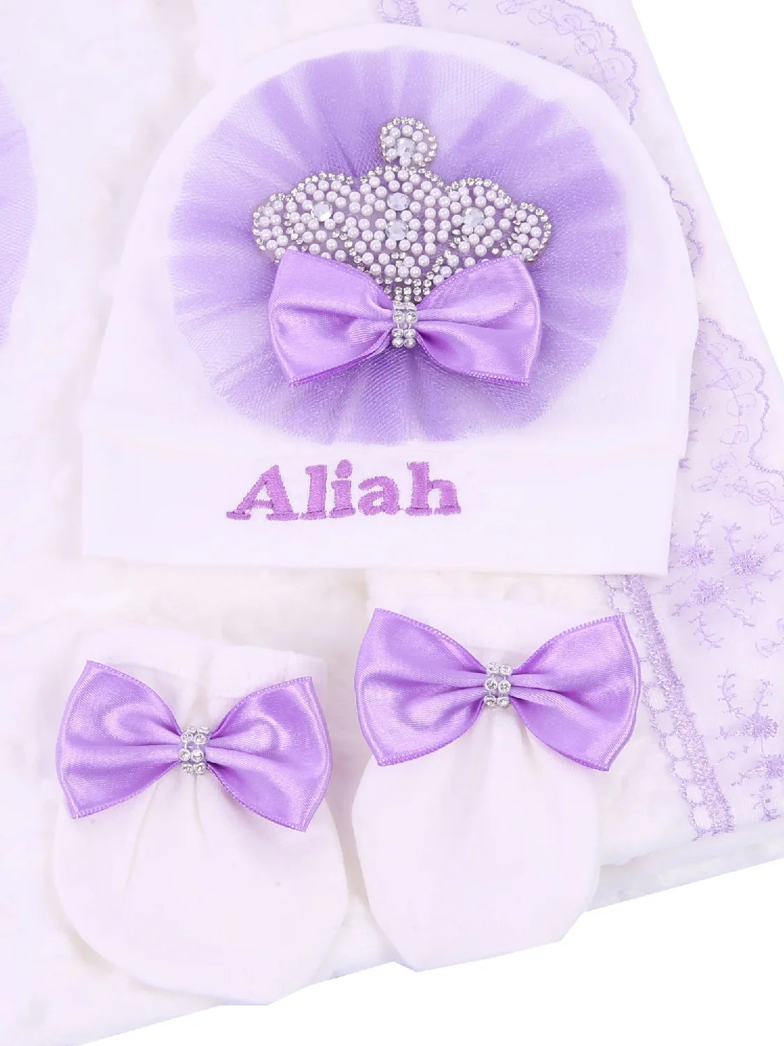 Our 5 pieces set is made up of soft, thick cotton. They are embellished with rhinestone buttons, crown jewels and bows.