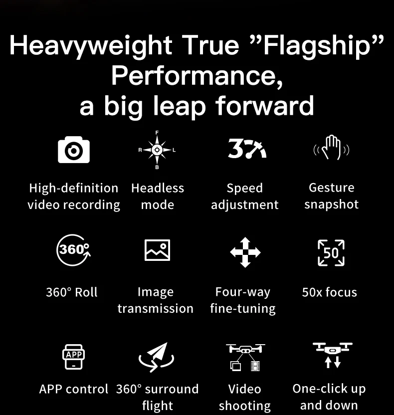 function: Headless mode,Altitude Hold Mode,3D View Mode,With Camera,With LED Lights,with G-sensor,3D flip,One Key Takeoff / Landing,App Control,Foldable