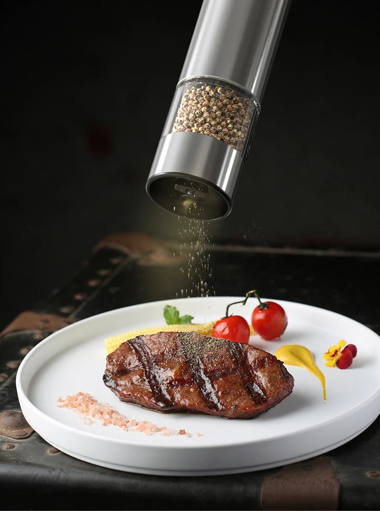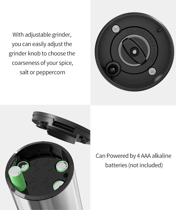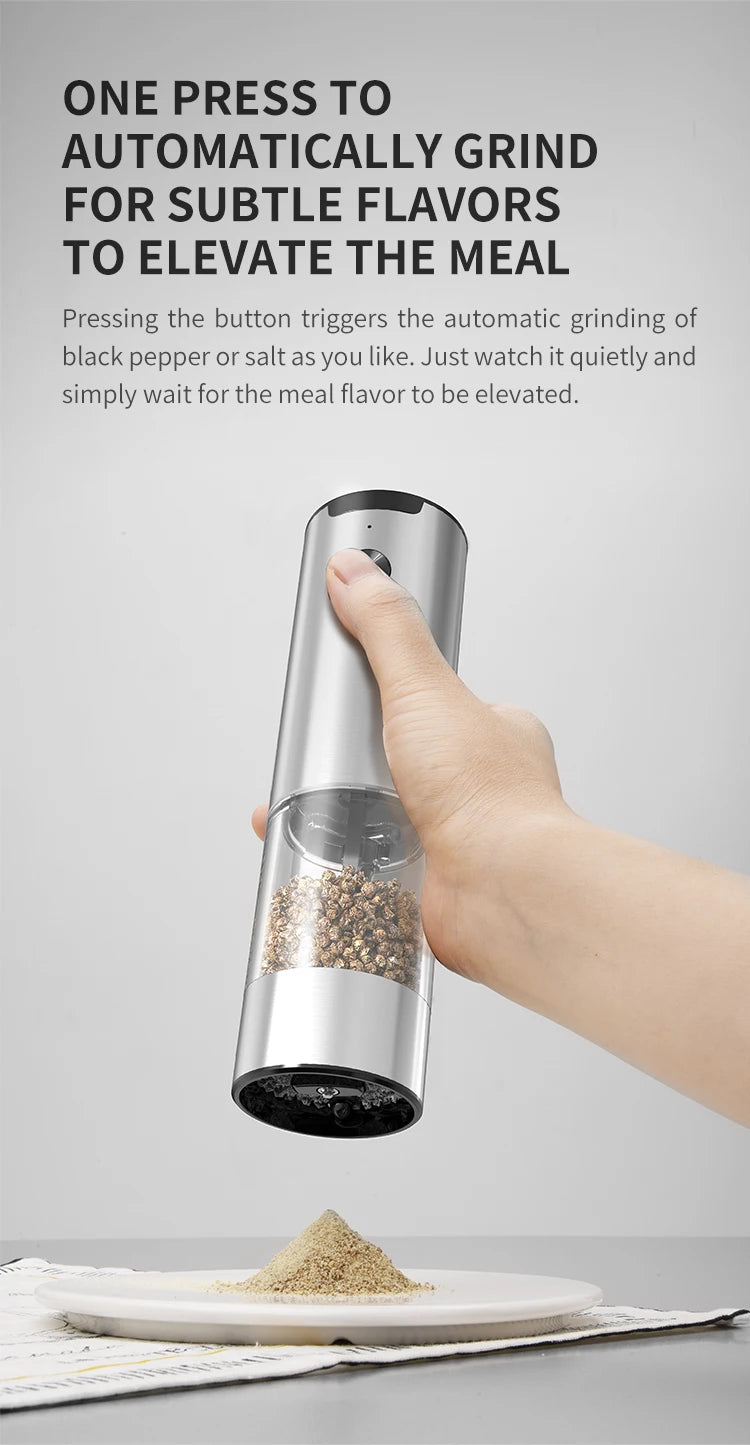 [HEALTHY STAINLESS STEEL MATERIAL AND UPGRADED LED LIGHT ] - This automatic sea salt and pepper grinder is made of stainless steel and ABS material for a stylish look and more durability. The built-in LED light illuminates the food and prevents over-seasoning, unlike other cheap blue lights that make it difficult to see how much seasoning is being used.