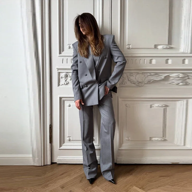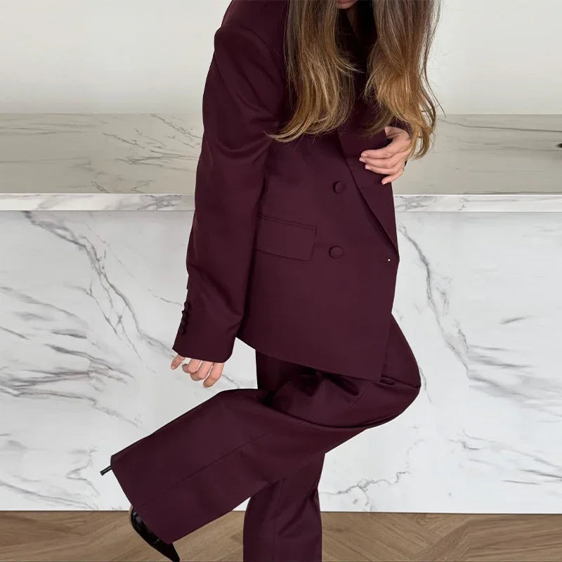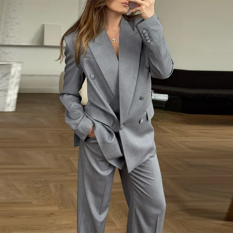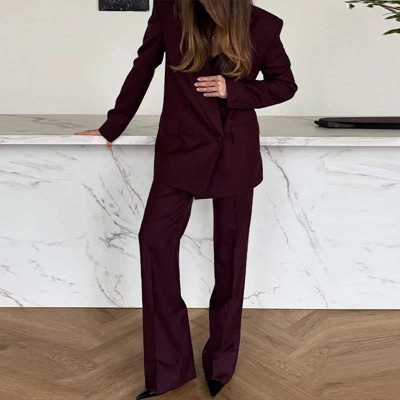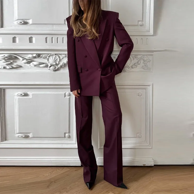 Elegant Blazer Coat Pants Set Women 2026 Lapel Double Breasted Jacket Straight Trousers Female Sets Spring Chic Lady Suit