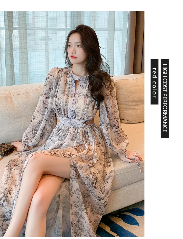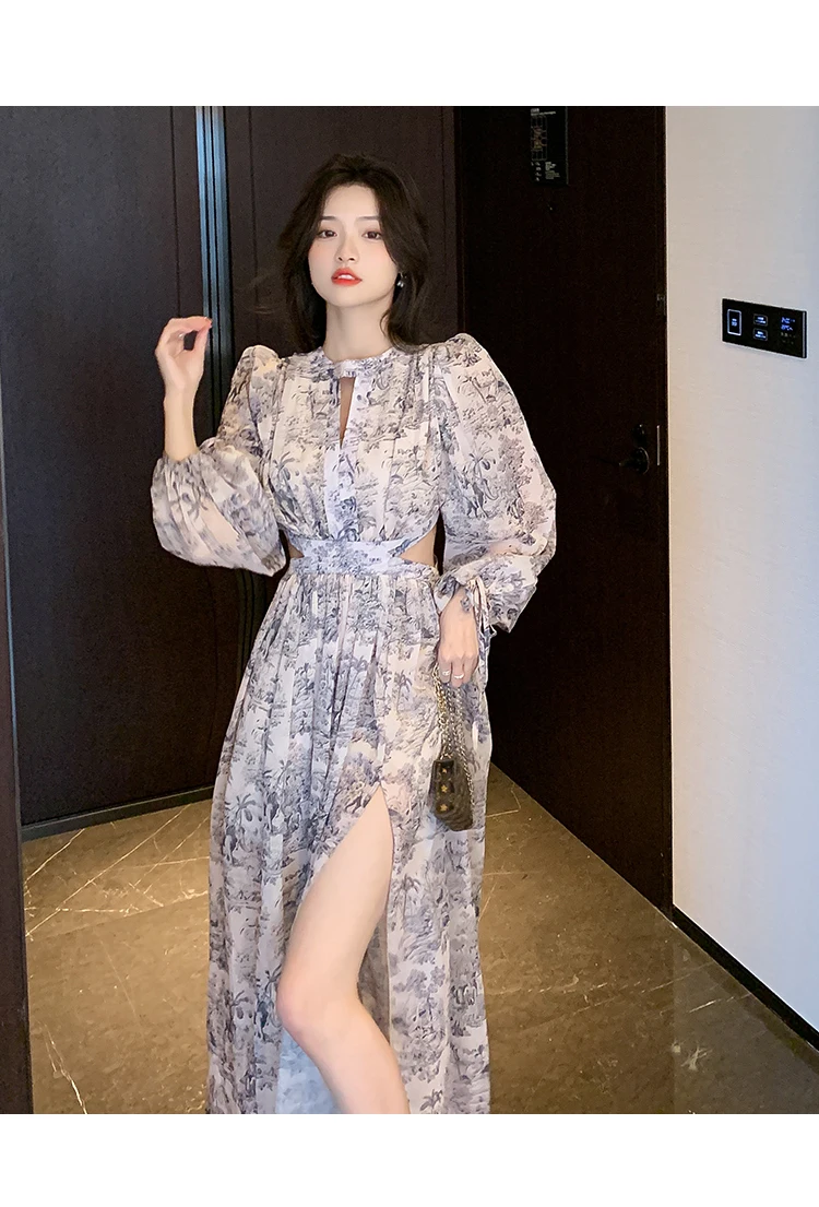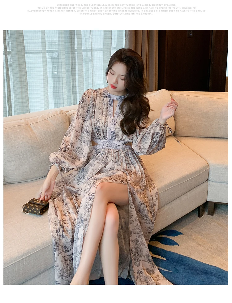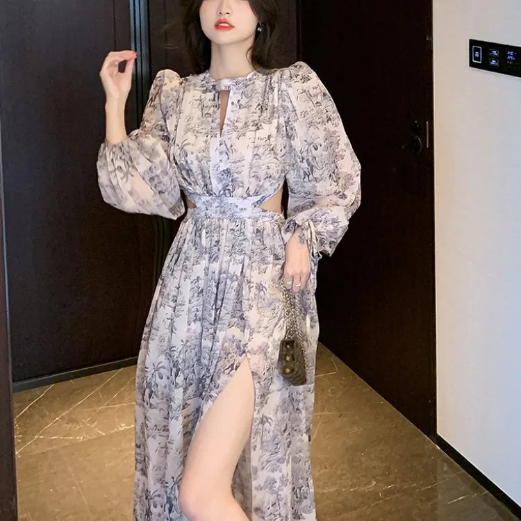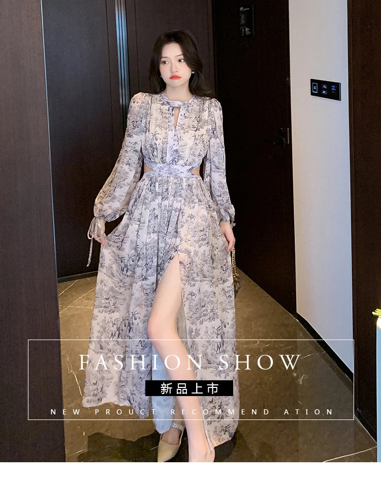 Elegant Boho Vintage Dress 2025 Spring Casual Printed Maxi Vestido Woman Sexy Hollow Waist Chiffon Beach Dress Female Clothing