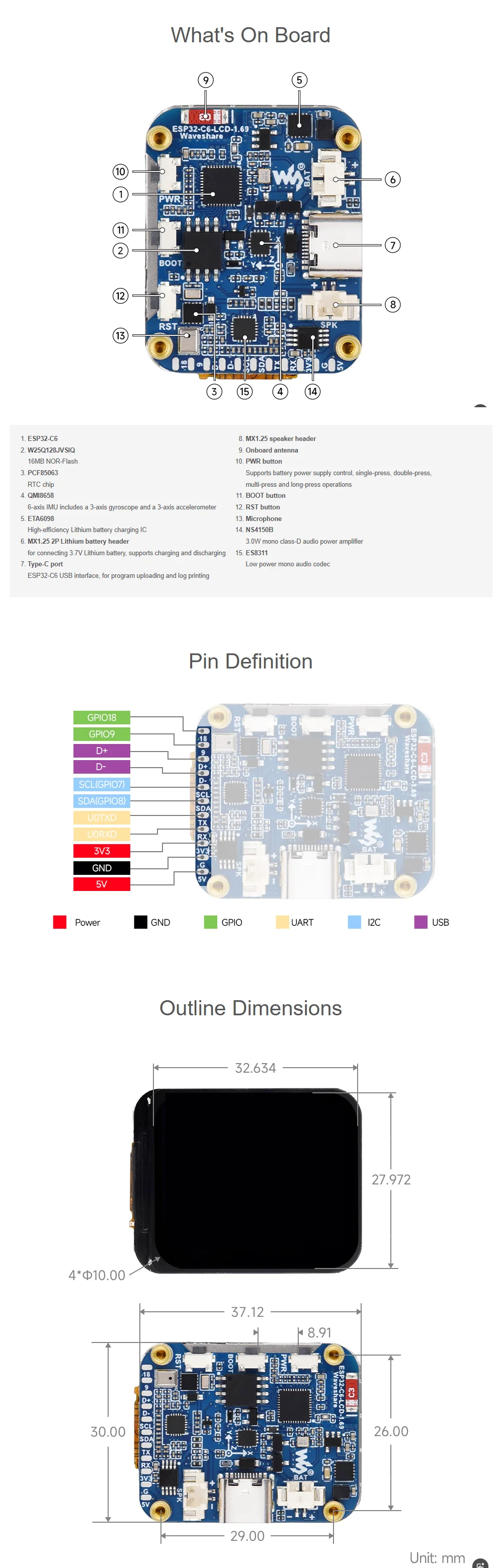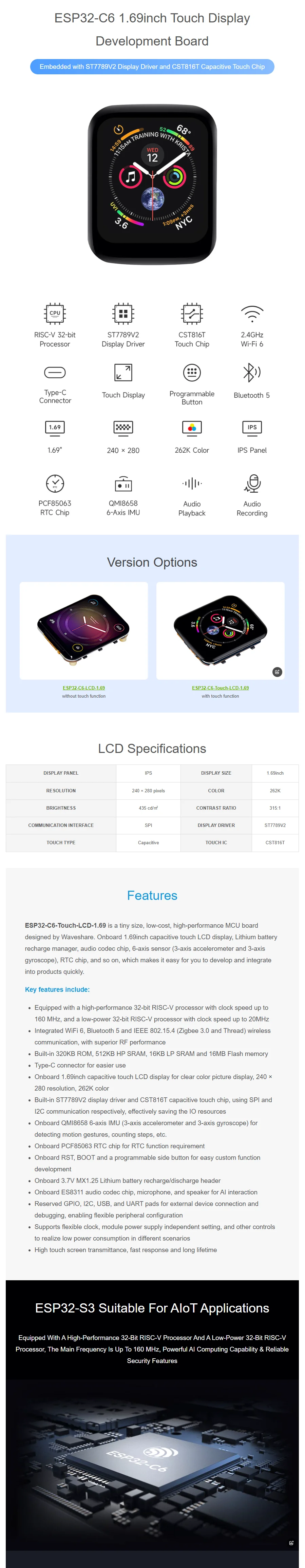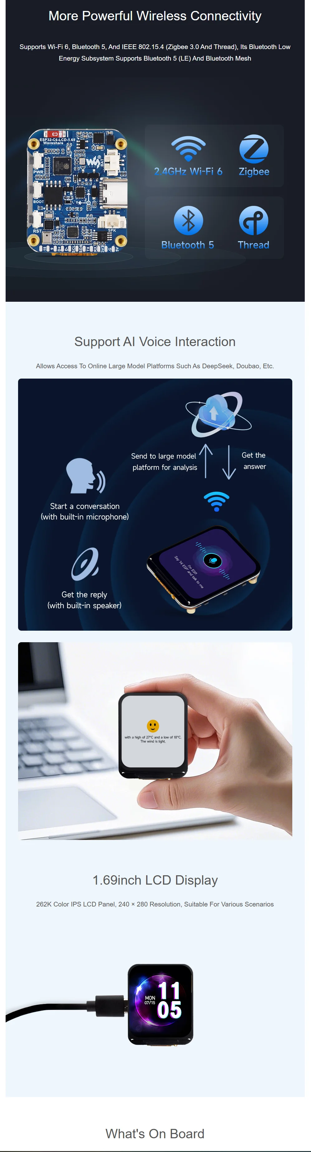 ESP32-C6 1.69inch Touch Display Development Board, 240*280 Pixels, Wi-Fi 6 / BLE 5, , AI Speech Deepseek, ESP32 With Display