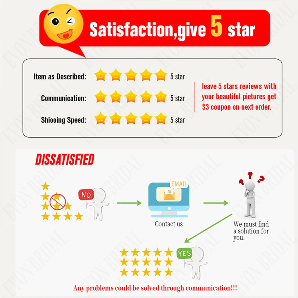 Your feedback is very important for us, please give us 5 stars if you satisfied with the dress,please contact us first if there is any problems.you can send email or chat with us on line,all email will be answered within 1 business day,if you do not receive our reply,please kindly resend your email,we will reply you as soon as possible.