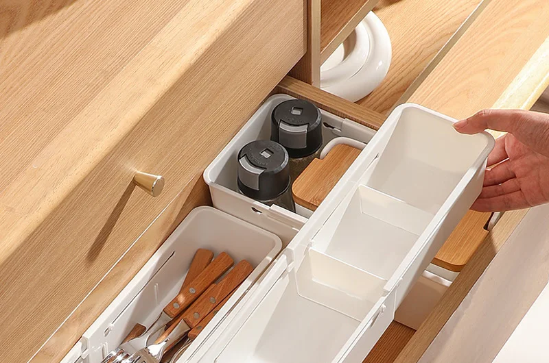 • Kitchen: Neatly store cutlery, spice bottles, and tools