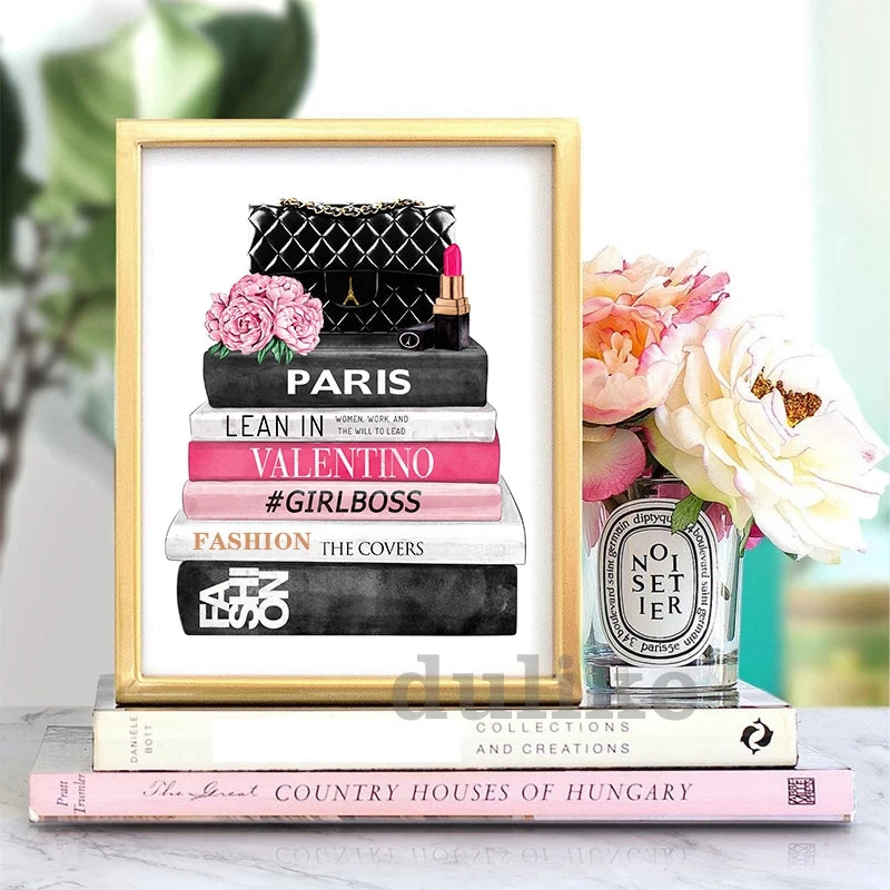 Fashion Magazine Wall Art Prints High Heels and Lipstick Modern Picture Poster Pink Flower Canvas Painting Girls Room Home Decor