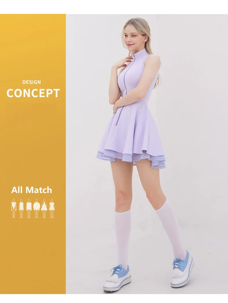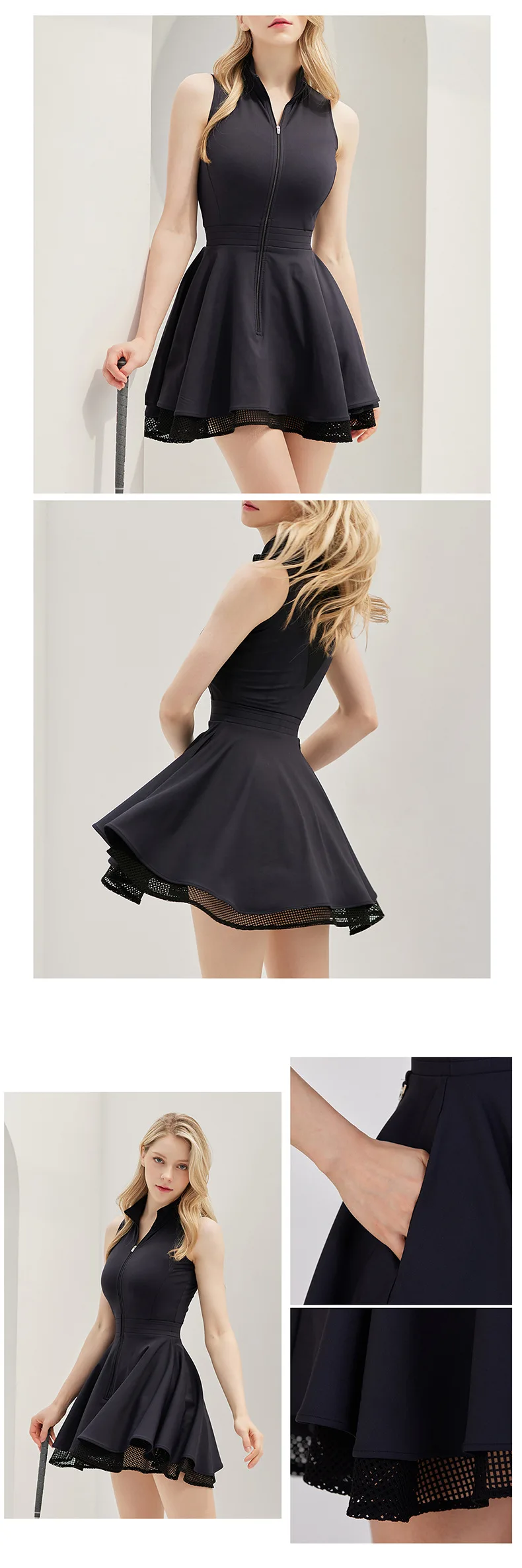 Fashion Tennis Golf Clothing Ladies Sleeveless Lace Sports Dress Quick Dry Half Zip Slim Dresses Woman Girls Sports Jersey Skirt