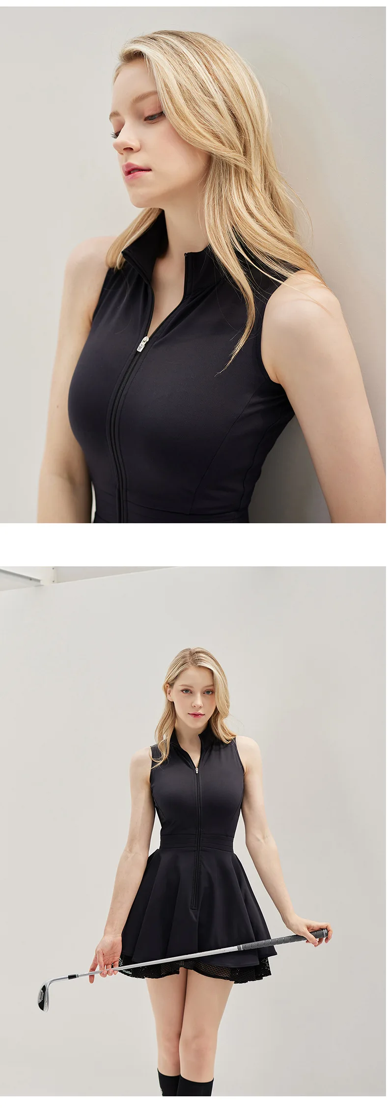 Summer Women Sleeveless Golf Tennis Dresses Ladies Zipper Collar Slim Badminton Skate Dress Double Layer Lace Outdoor Skirt Casual Running Sportswear