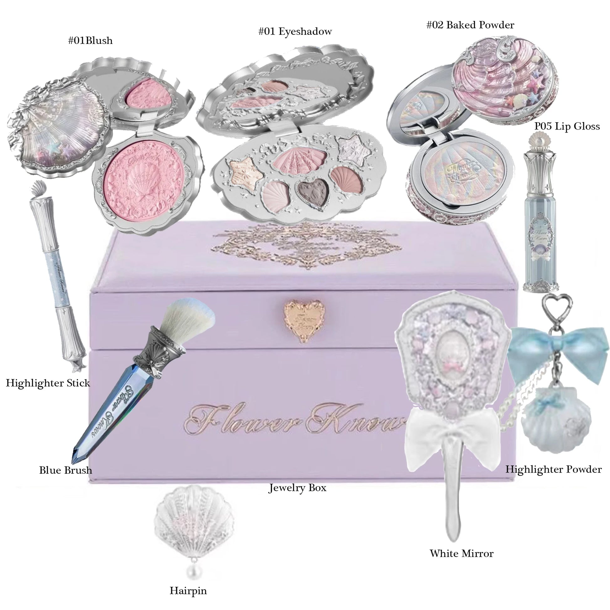 Flowerknows Shell Jewelry Gift Set Makeup Kit Full Professional Glitter Eyeshadow Palette Blush Baked Powder 10pcs Kits