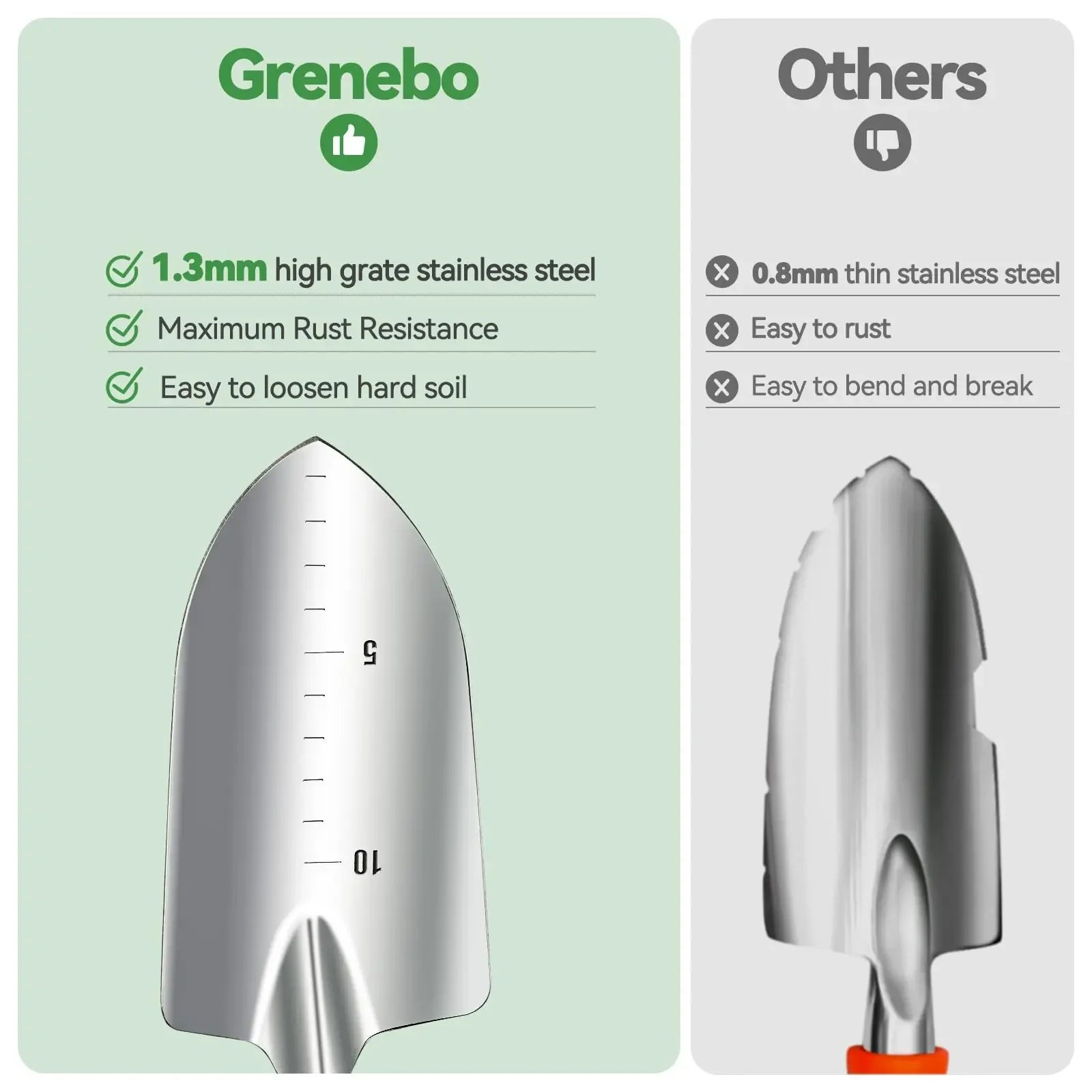 One for All Package: Grenebo garden tools set includes a total of 8 tools and 1 storage bag. Pruning Shears, Weedier, Transplanter, Cultivator, etc., nearly everything you need in daily garden maintenance.
