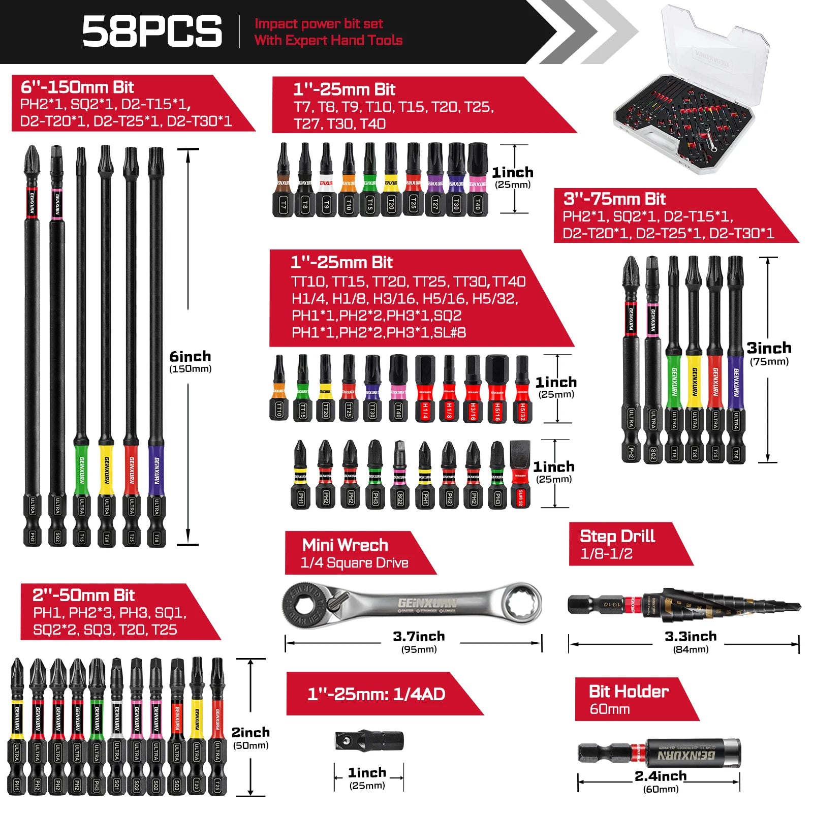 Geinxurn 58Pcs Tools Set Packaged with Impact Screwdriver Bits,Mini Wrech,Step Drill,Socket Adapter and Bit Holder for DIY