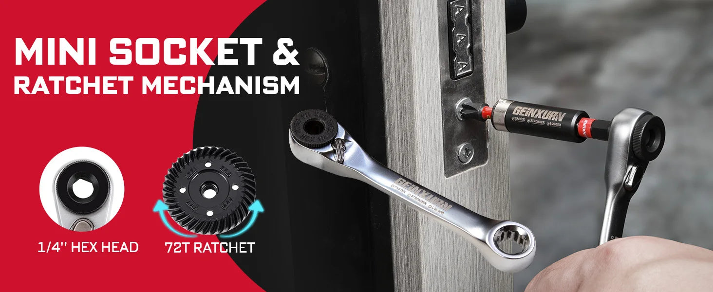 1/4”hex shank ratchet head, connectable to handle or bit extension for low-profile, rapid rotation – ideal for tight spaces inaccessible to standard tools