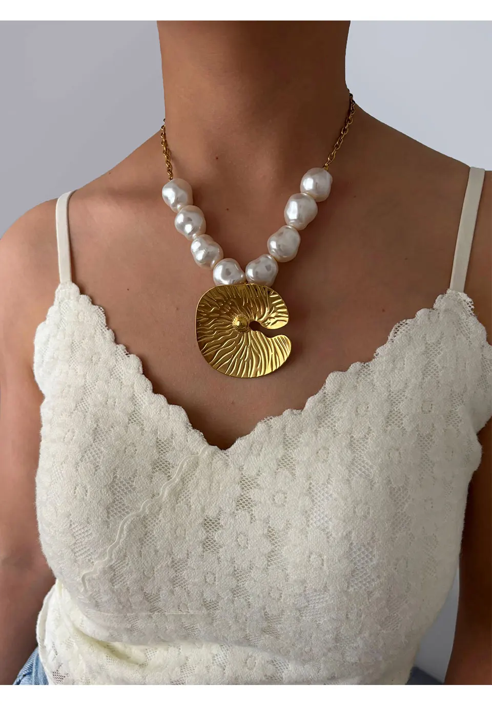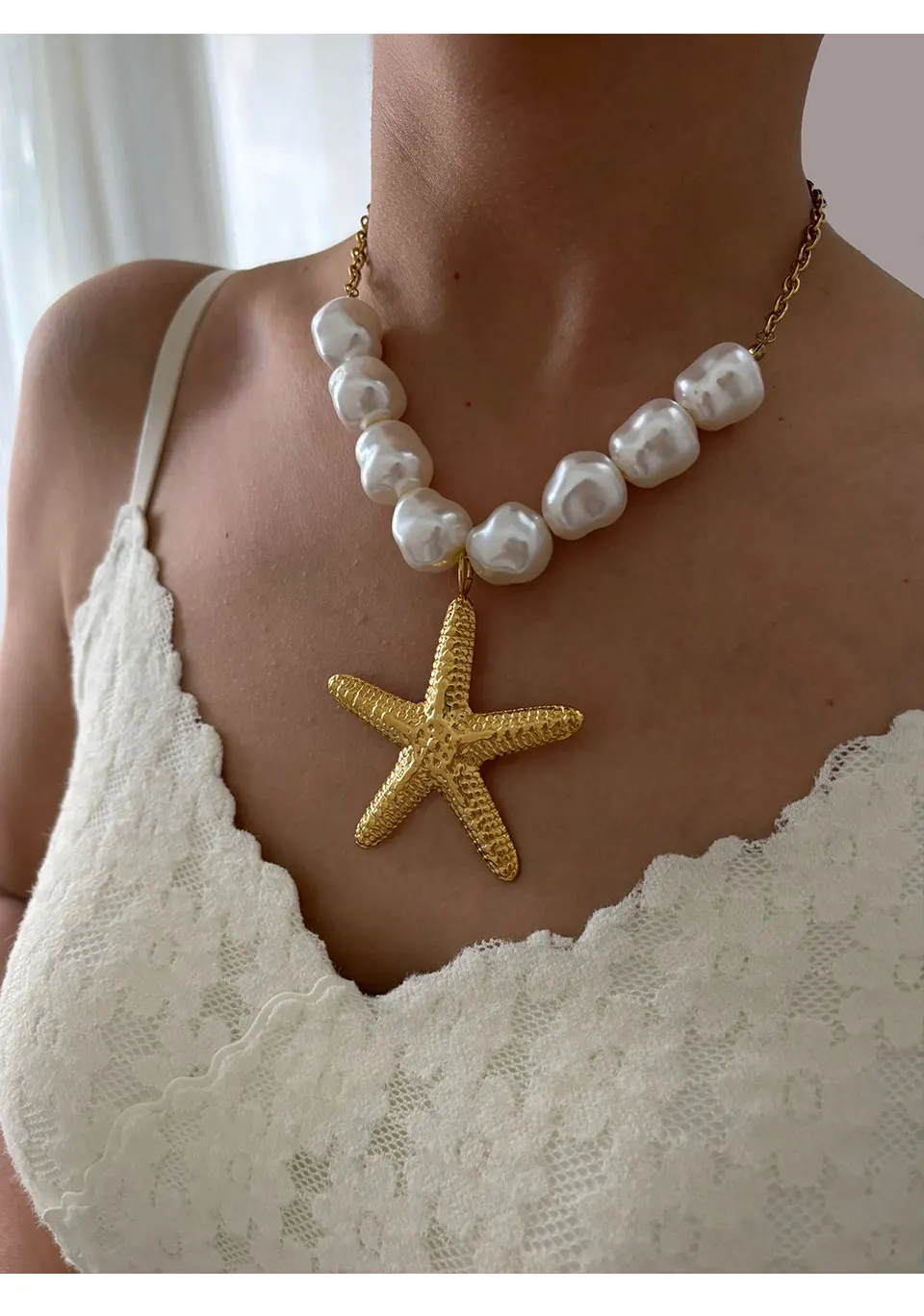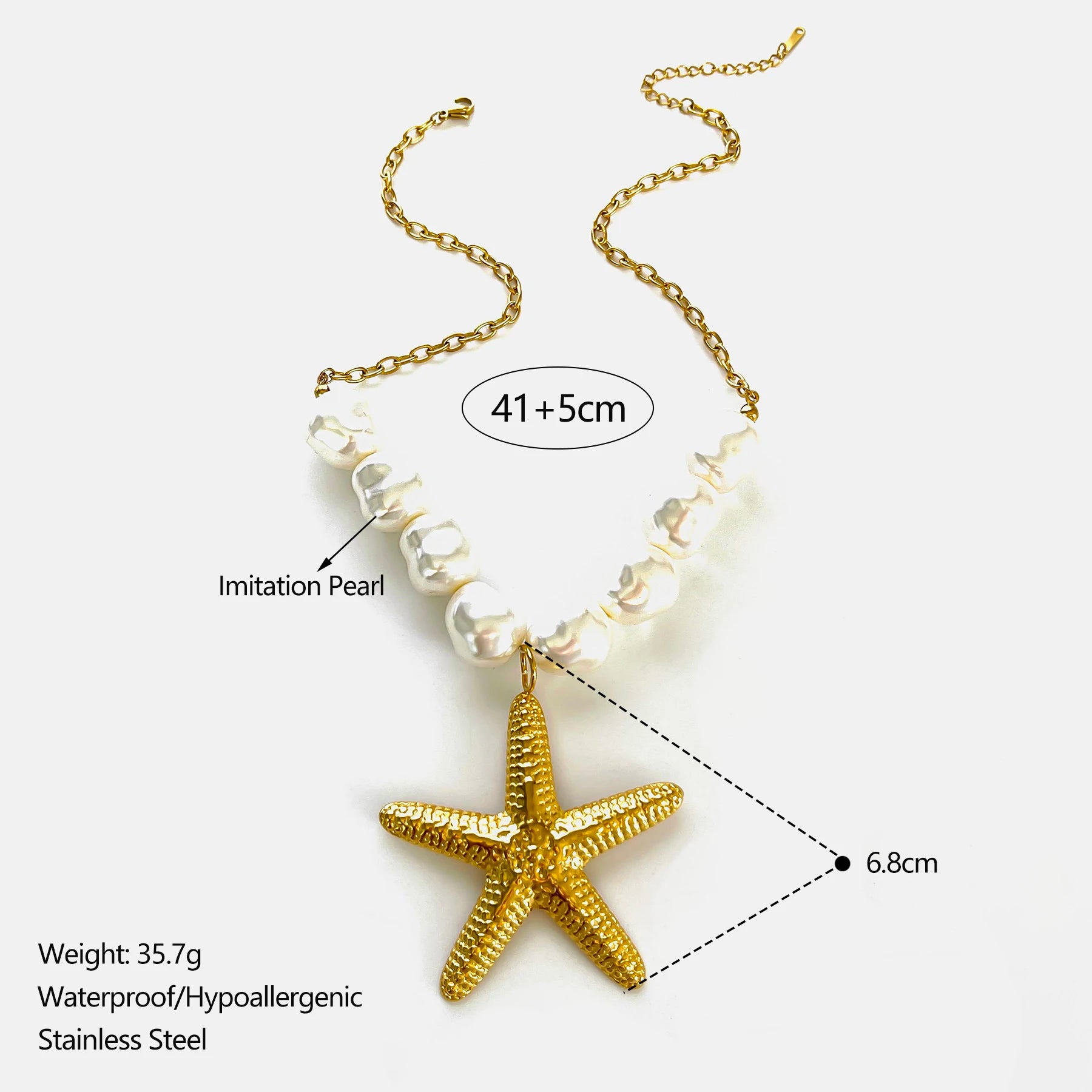 GHIDBK Exaggerated Punk Big Starfish Irregular Round Pendant Necklaces for Women Imitation Baroque Pearl Collarbone Chain Summer