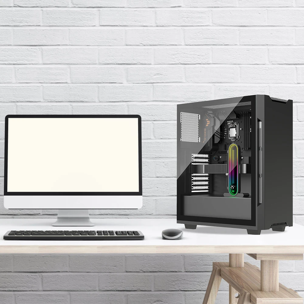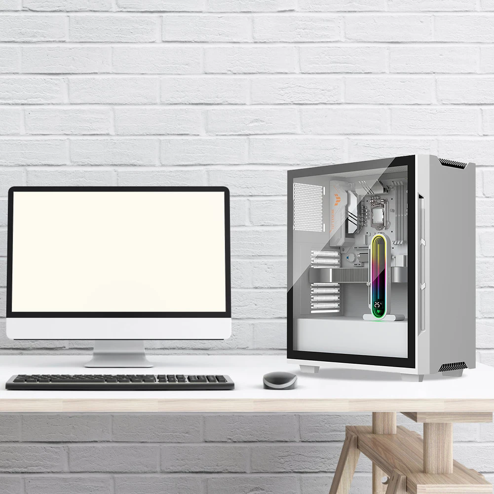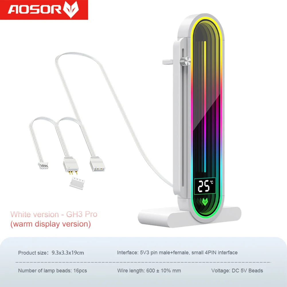 Feature: 1. Temperature Display Screen: The graphics card bracket features an artistic design with an arc full-screen lens, supporting LED smart temperature display. The new generation of automatic temperature sensing technology displays the internal temperature of the case in real-time, allowing you to monitor the operating status easily. (Only G30 Pro series supports this feature.) 2. ARGB Infinite Lens Lighting: The vga holder is equipped with a 5V 3-pin ARGB male and female interface, supporting motherboard addressable (5V) ARGB sync interface for software-controlled lighting. It can be programmed to define 16.8 million dazzling lighting effects. The overall arc full-screen lens, with 16 high-brightness LED beads, provides soft and full lighting. The infinite lens offers an infinite geometric state, bringing you stunning ARGB lighting effects. 3. Sliding Adjustable Design: The graphics video stand allows for height adjustment and locking of the support rod through hand-tightened screws. With a 122mm sliding slot height and a maximum adjustable height of 155mm, it is convenient and quick to operate, meeting different height requirements. It provides effective support for the tail of the graphics card, ensuring stable operation. 4. Aluminum Alloy Material: The graphics card gpu brace is made of sturdy aluminum alloy material, which is durable and long-lasting. The surface is treated with CNC technology, offering an outstanding texture that remains new over time. It provides stable support and protection for the graphics card, preventing sagging and ensuring balanced and stable operation. This makes your work easier and gaming more enjoyable. 5. Stable Anti-Slip Base: The video card bracket stand features a magnetic design at the bottom for strong and stable adsorption, with a hidden design that facilitates installation. It can be attached to the power compartment, case bottom plate, or other iron materials. The rubber pad prevents scratches on the case and reduces vibration during operation, providing stable support and considerate protection for your graphics card. Specification: Origin: Mainland China Type: Graphics Card Bracket RGB Support: A-RGB Material: Aluminum Single Or Dual Flow: SINGLE With Screen: YES Bundle: N Product model: GH3 (lens version) Product color: black, white (optional) Product material: aluminum alloy + rubber pad Product voltage: DC 5V lamp beads Product lighting effect: Infinite lens lighting, ARGB fantasy, 16.8 million colors ARGB description: Supports connection to motherboards Compatible with ASUS/MSI and other major brands with addressable 5V 3-pin ARGB interface, realizes software control of Shenguang synchronization, DIY at will, programmable and customized 16.8 million colors Number of lamp beads: 16pcs Product interface: 5V 3-pin male + female, small 4PIN interface Height adjustment: slide up and down, the highest height is 155mm Slide height: 122mm Wire length: 600mm Product size: 190.00x93.00x33.00mm/7.48x3.66x1.3inch Product weight: 0.42kg (including packaging) Note: If the motherboard supports 5V 3-pin ARGB interface, you don't need to use ARGB controller, you can connect directly to the motherboard. If it does not support, it cannot be used alone and must be used with ARGB controller Note: ![]() 1 X Graphics Card Bracket Without Digital Display