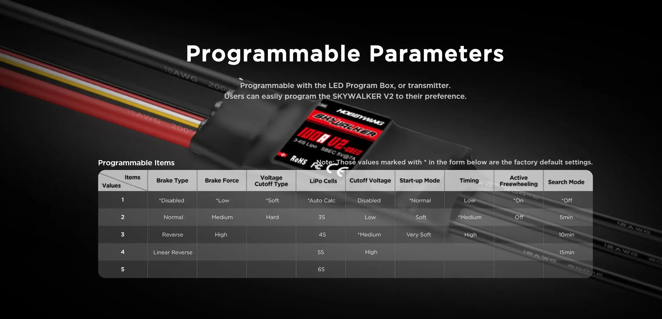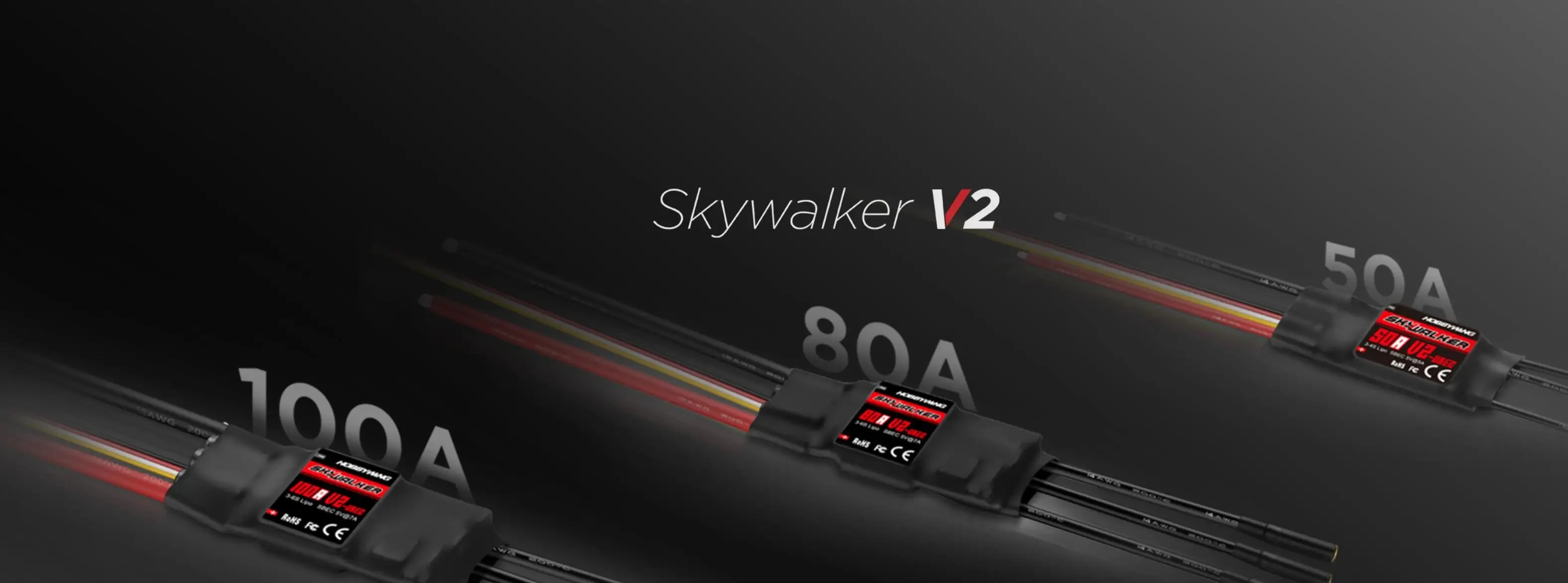 Item: Hobbywing Skywalker 20A 30A 40A 50A 60A 80A 100A V2 series ESC Speed Controler Parameters: 20A: Model: Skywalker-20A Continuous Current: 20A Burst Current (>10s): 25A BEC Mode: Linear BEC Output: 5V2A BEC Output Capability: 5 Servos (2S Lipo) / 4 Servos (3S Lipo) Battery Cell: 2-3S (Lipo) / 5-9 cells (NiMH) Net Weight: 19g Dimension (L x W x H): 42 x 25 x 8mm Cable length: 25cm Package size: 12.5 * 11 * 2.5cm 30A: Constant Current: 30A Peak Current:40A(10s) Voltage: 2-3S lixx BEC: Yes BEC Output: 5V/2A Color: black Programmable:Yes Size: 70*25*8mm (not including cable length) Net Weight:38g 40A V2: Model: Skywalker-40A V2 UBEC Continuous Current: 40A Burst Current (>10s): 55A BEC Mode: Linear BEC Output: 5V5A BEC Output Capability: 5 Servos (3S Lipo) / 4 Servos (3S Lipo) Battery Cell: 3-4S (Lipo) Net Weight: 35g Dimension (L x W x H): 68 x 25 x 8mm Backward thrust:YES 50A V2: COntinuous output: 50A V2 UBEC Burst current: 60A@10S Power input: 3-4S Lixx/11-12S Nixx 5V/5A BEC output, switch mode Refresh rate: 50Hz-432Hz Max. rotation speed: 2-Pole 210000rpm/min; 6-Pole 70000rpm/min; 12-Pole 35000rpm/min Dimension: 68*25*12mm Weight: 43g Backward thrust:YES 60A: Item Name: Hobbywing SkyWalker 60A UBEC ESC Constant Current: 60A Burst Current (>10s): 80A BEC Mode: switch mode BEC Output: 5V at 3A Battery Cell: 3-6 cells Lipo,or 11-18 cells NiHH Refresh Rate: 50Hz-432Hz Dimension: 77 x 35 x 14 mm Weight: 63g Maximum speed: 210000 RPM (2 poles motor), 70000 RPM (6 poles motor), 35000 RPM (12 poles motor) 80A V2: Item Name: SkyWalker 80A V2 UBEC Type: Brushless ESC,Regular voltage Cont./Peak Current: 80A/100A Input: 3-6S LiPo,11.1-18s Ni-MH BEC Output: Switch Mode--5V,7A Input Wires: Red-12AWG-150mm*1,Black-12AWG-150mm*1 Output Wires: Black-14AWG-100mm*3 Input Connectors: NO Output Connectors: NO ESC Programing via: Transmitter,LED Program Card,Program Port (Program/Throttle Wire) Firmware Upgrade: Not Supported Size: 85.0x36.0x9.0mm Weight: 79g Backward thrust:YES 100A V2: Item Name: SkyWalker 100A V2 UBEC Type: Brushless ESC,Regular voltage Cont./Peak Current: 100A/120A Input: 3-6S LiPo,11.1-18s Ni-MH BEC Output: Switch Mode--5V,7A Input Wires: Red-12AWG-150mm*1,Black-12AWG-150mm*1 Output Wires: Black-14AWG-100mm*3 Input Connectors: NO Output Connectors: NO ESC Programing via: Transmitter,LED Program Card,Program Port (Program/Throttle Wire) Firmware Upgrade: Not Supported Size: 85.0x36.0x9.0mm Weight: 92g Backward thrust:YES Features: High Quality & Reliability Good quality comoponents guarantees the high quality and reliability of SkyWalker series of aircraft ESC. Programmable Parameters With a LED program card, then you can program relevant parameters on your Skywalker to your personal preference. Multiple Protections Multiple protection features include abnomal input voltage, ESC thermal, throttle signal loss (or Fail Safe), and low voltage cutoff effectively prolongs the service life of the ESC. Package Included: Hobbywing SKYWALKER V2 series ESC x1