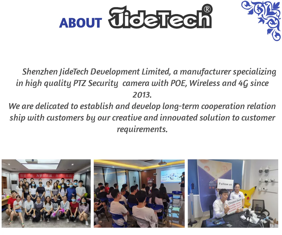 Shenzhen Gentlen Technology Development Co., Limited was found in Jan-2013, Located in Longhua New District, Shenzhen, GuangDong, China. Our company is devoting to the development CCTV surveillance system products. Our owner brands "JideTech" & "Gentlen"were won trademark certificates issued by the North American and European Union Trademark Offices respectively in 2015 and 2017, And formed a certain degree of visibility. Our company has strong technical force, has 5 experienced and technical R&D talents and 16 highly qualified sales personnel.