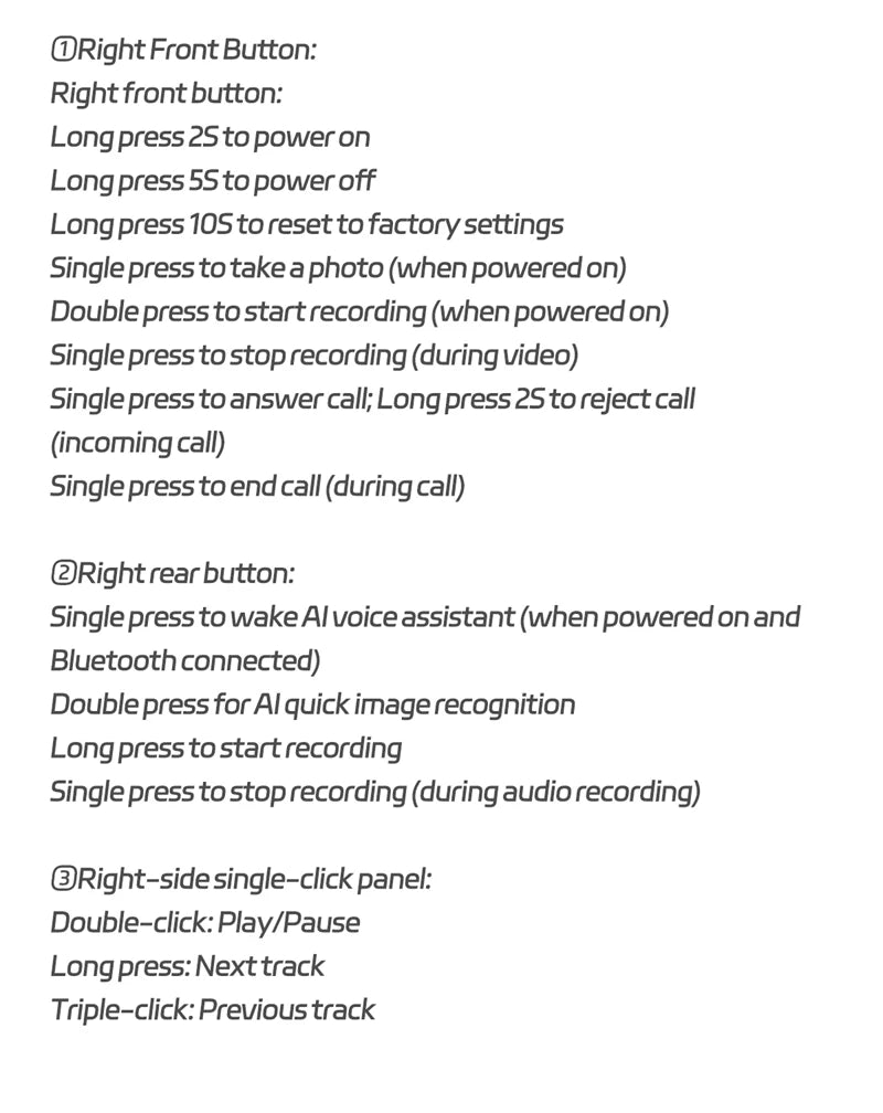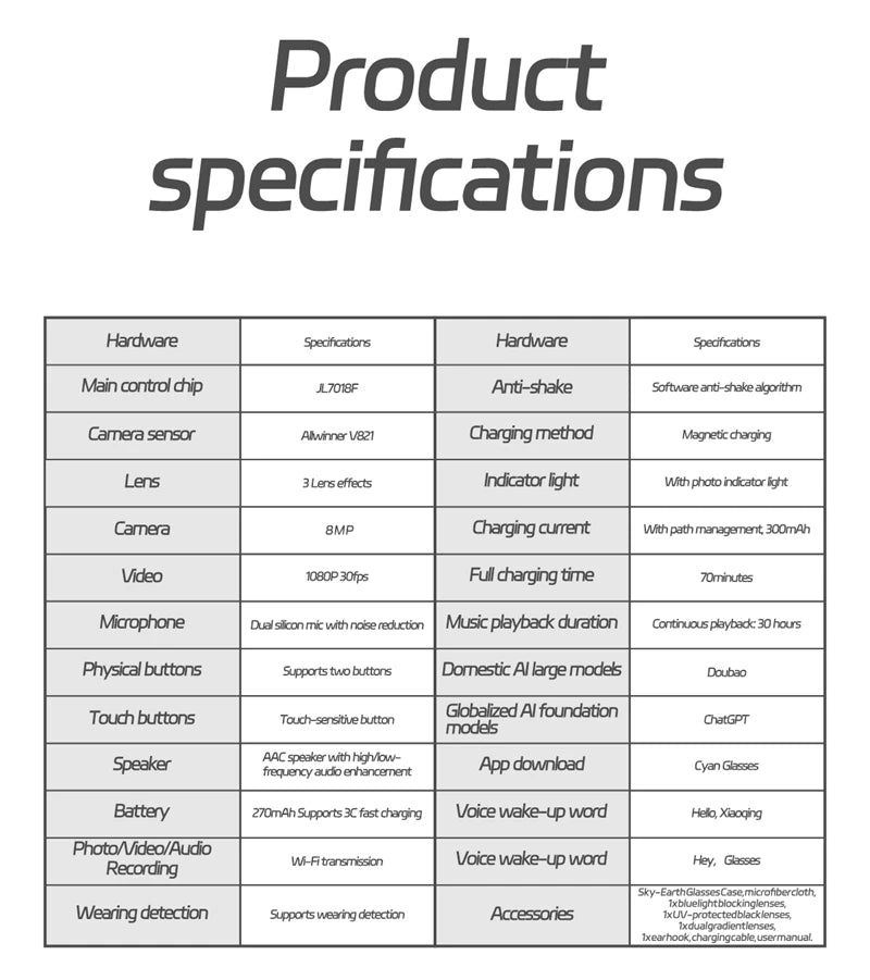 Main Features: AI voice assistant/photo taking/video recording/audio recording/music control/calling/alert sounds/indicator lights/translation/object recognition/touchscreen/music playback (music control, local music) etc.