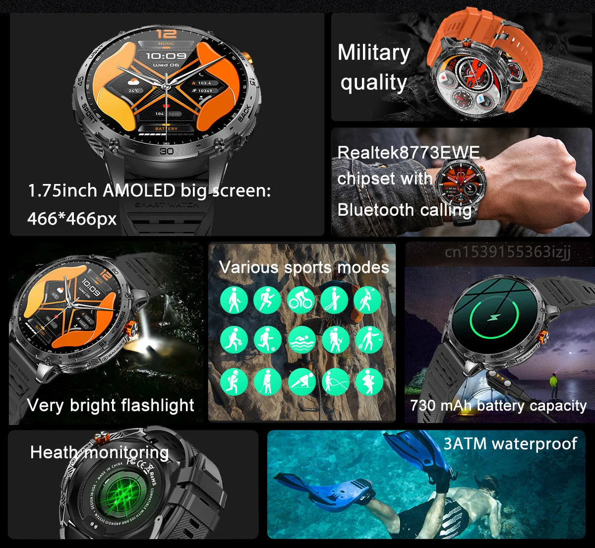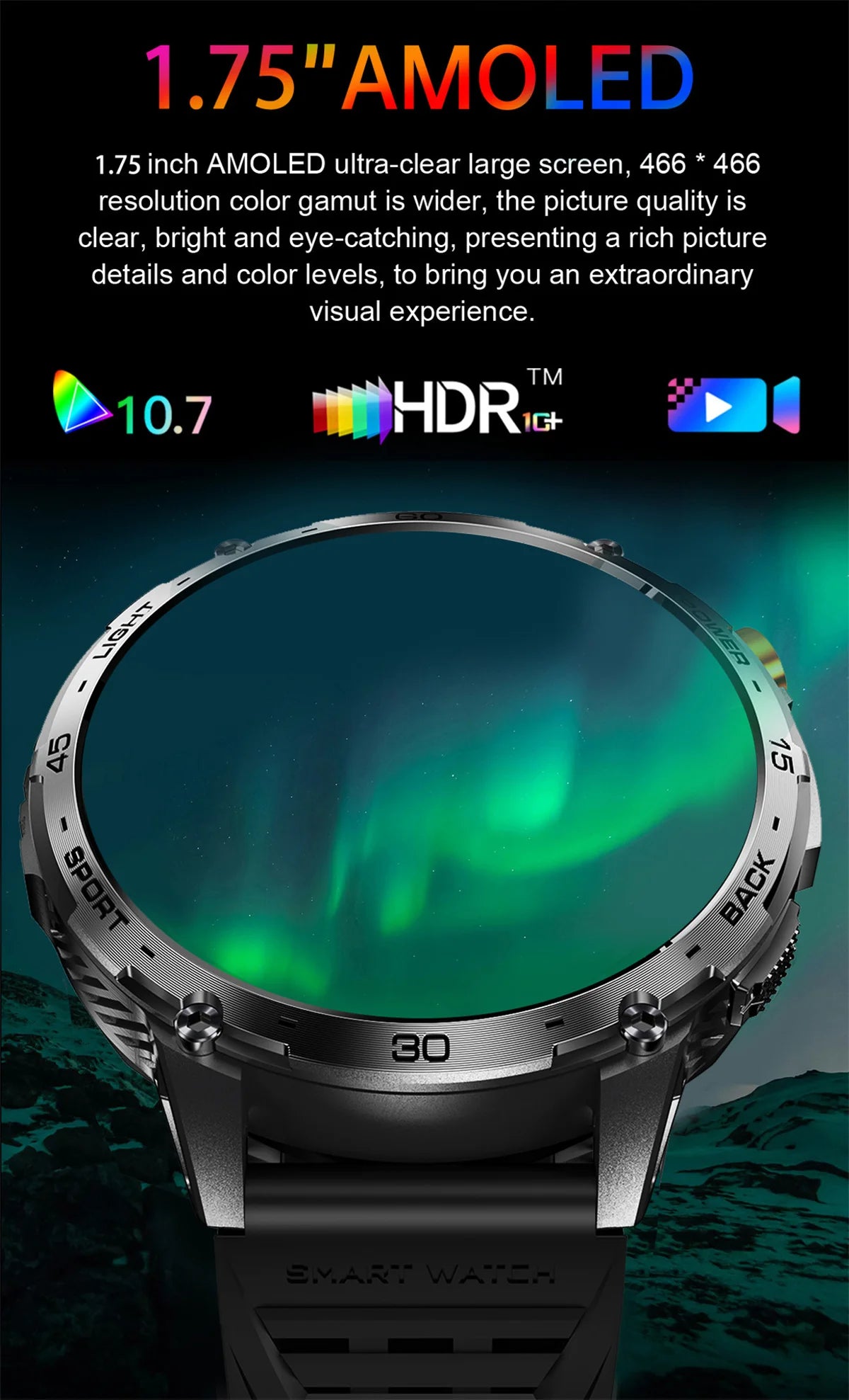 K69 Smart Watch 1.75inch Amoled Screen LED Flashlight Men Bluetooth Call Sports Fitness Tracker Health Monitor Smartwatch
