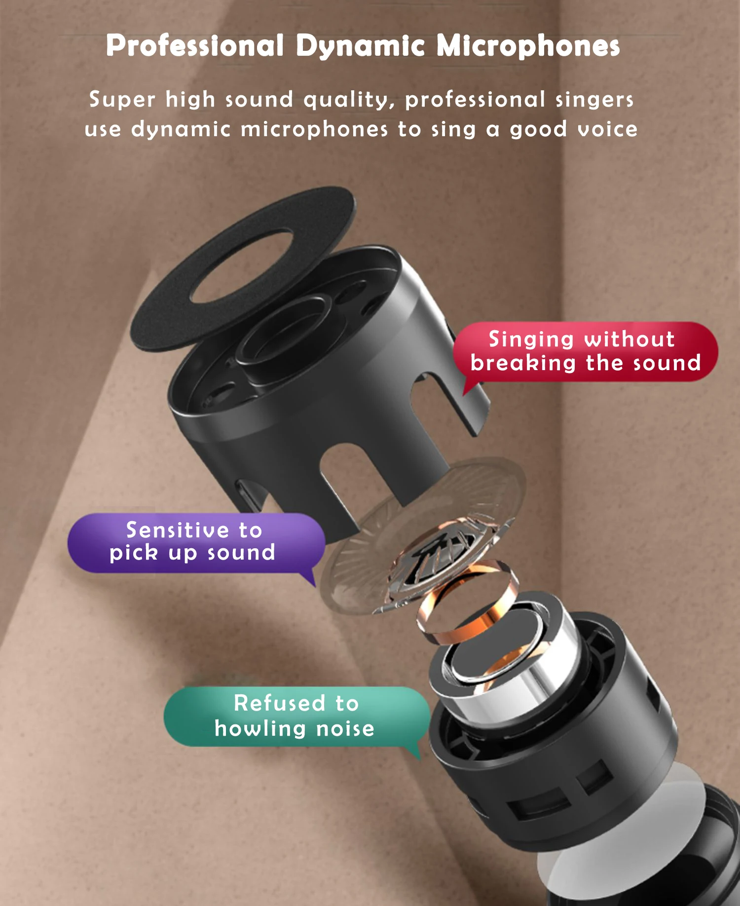 The microphone adopts the dynamic mark used by professional singers, which is sensitive to the sound and has no howling and cracking sound, allowing you to experience high-quality sound.