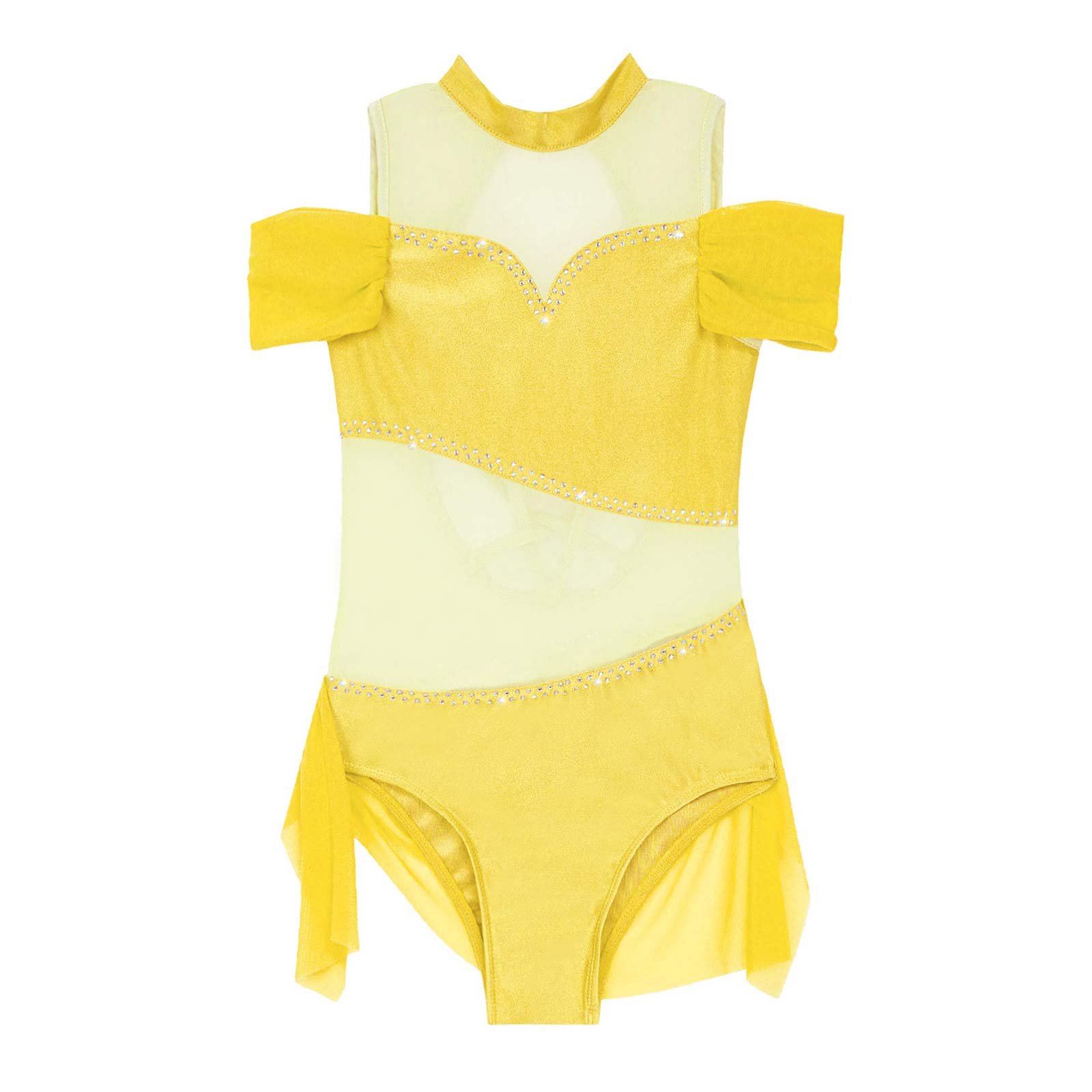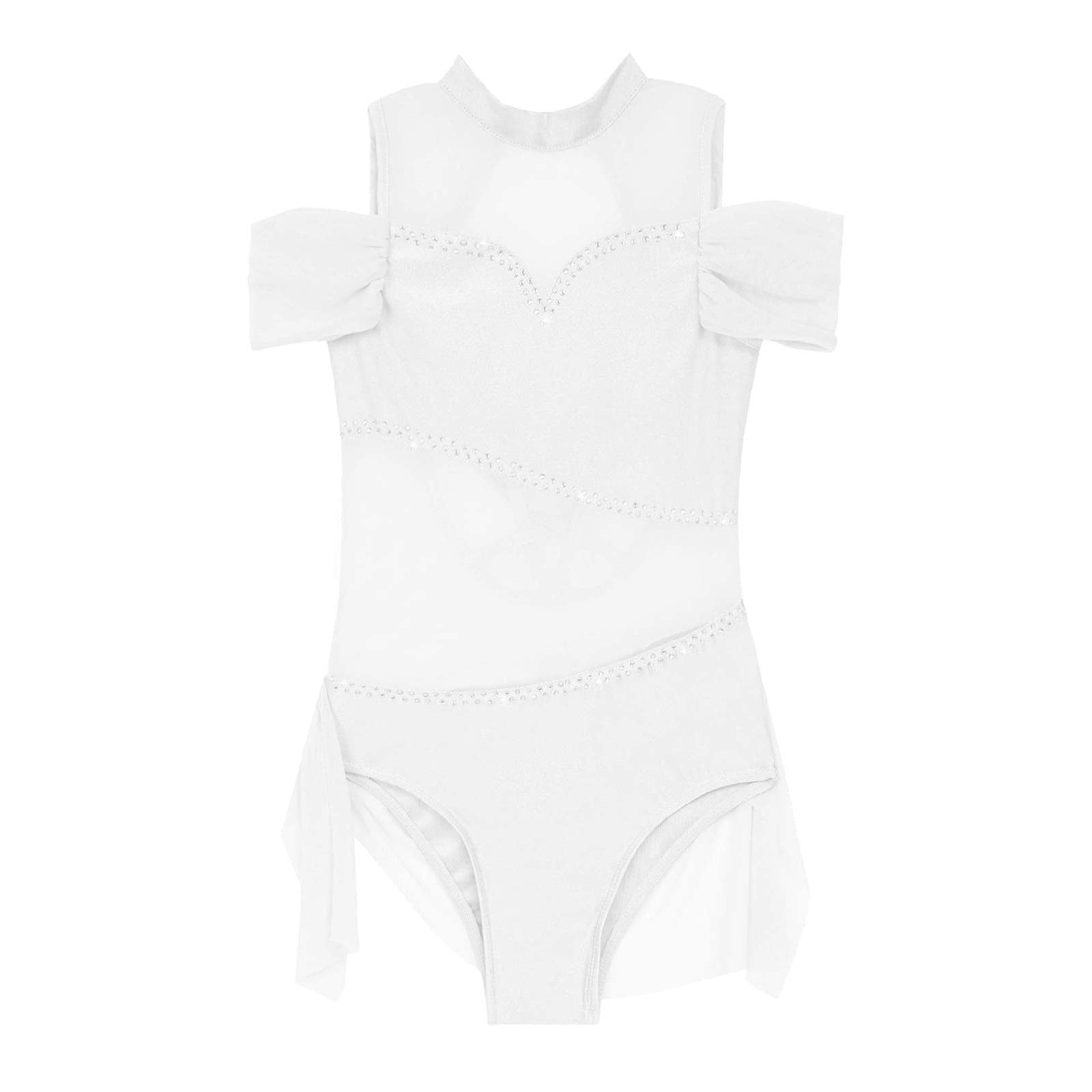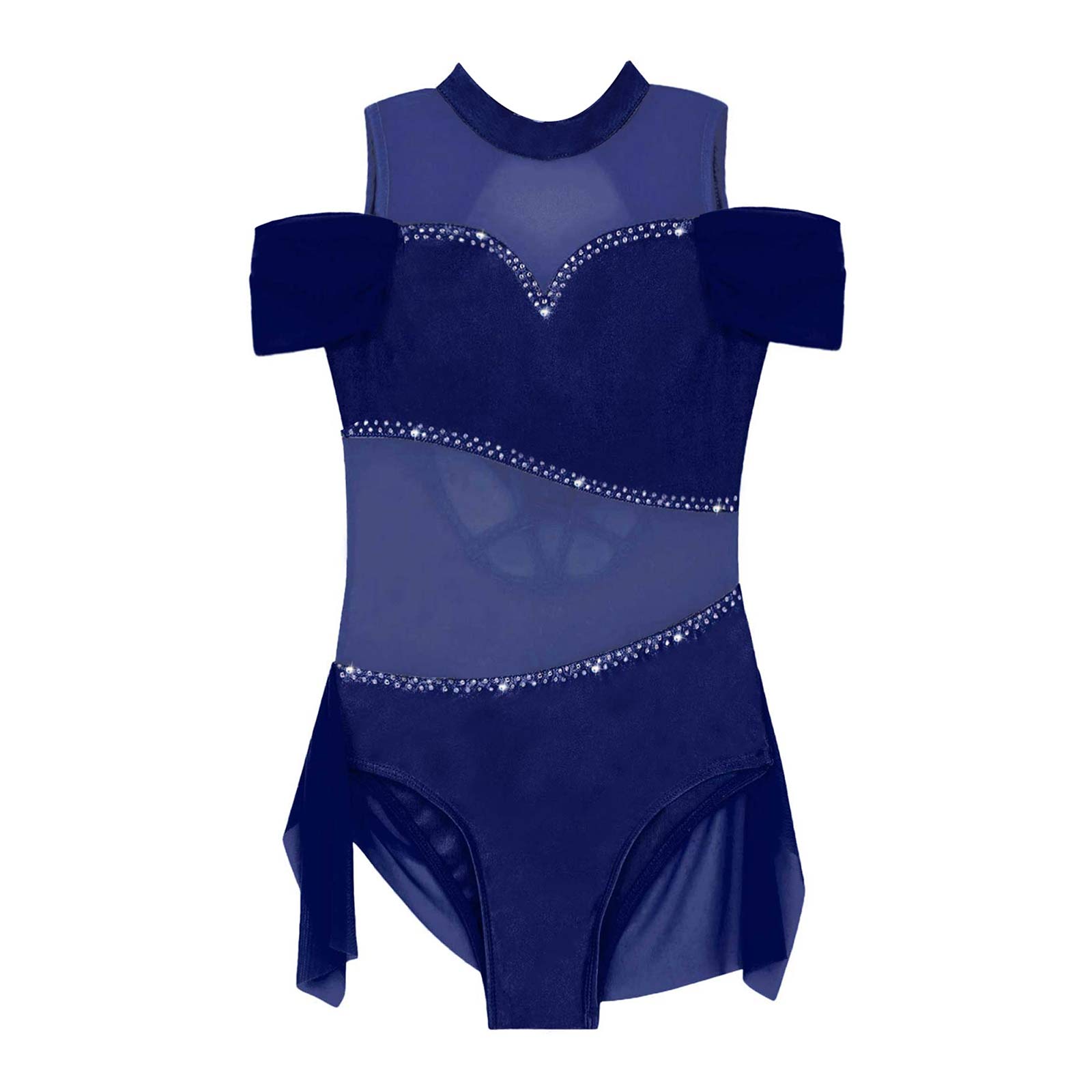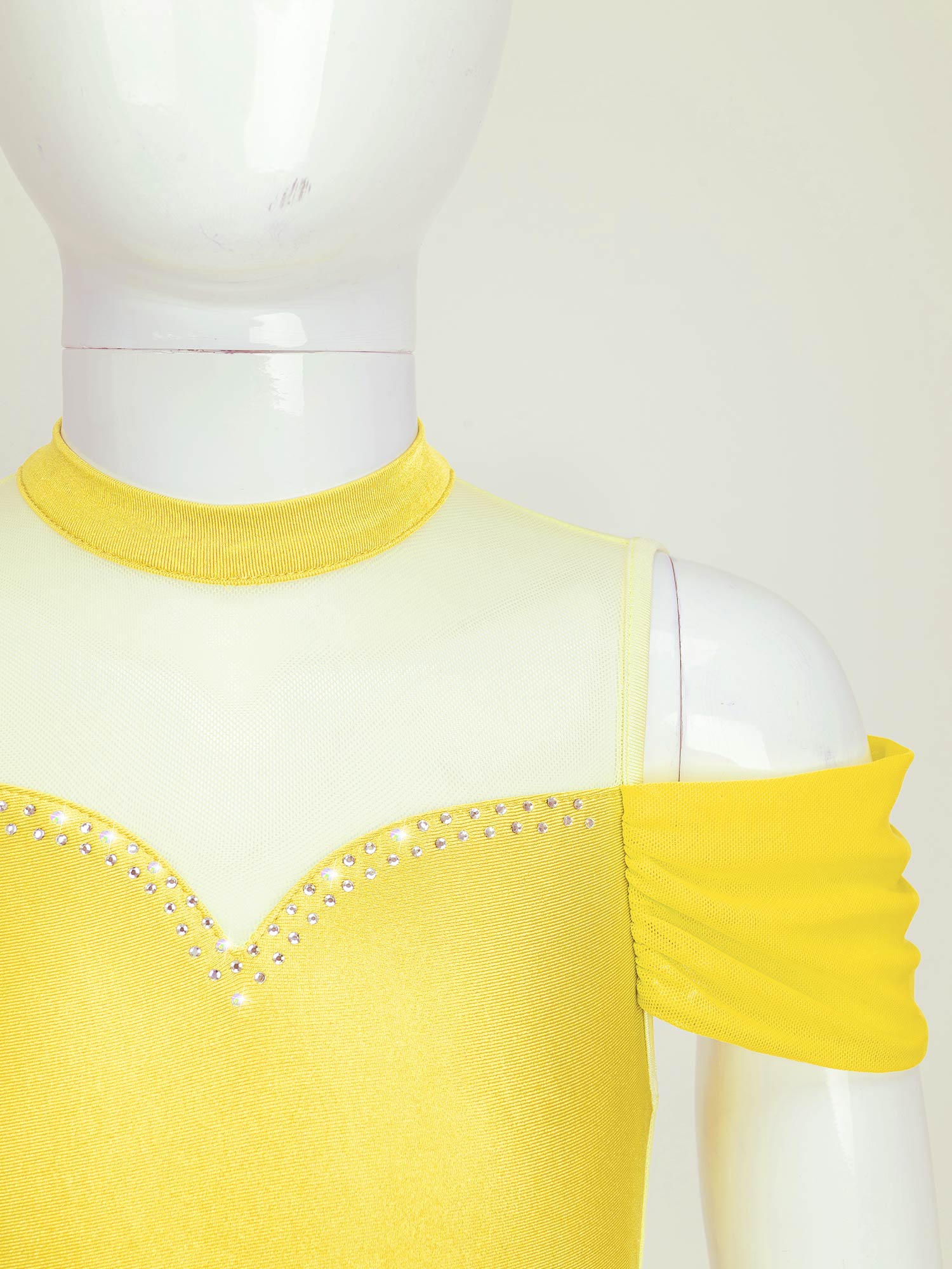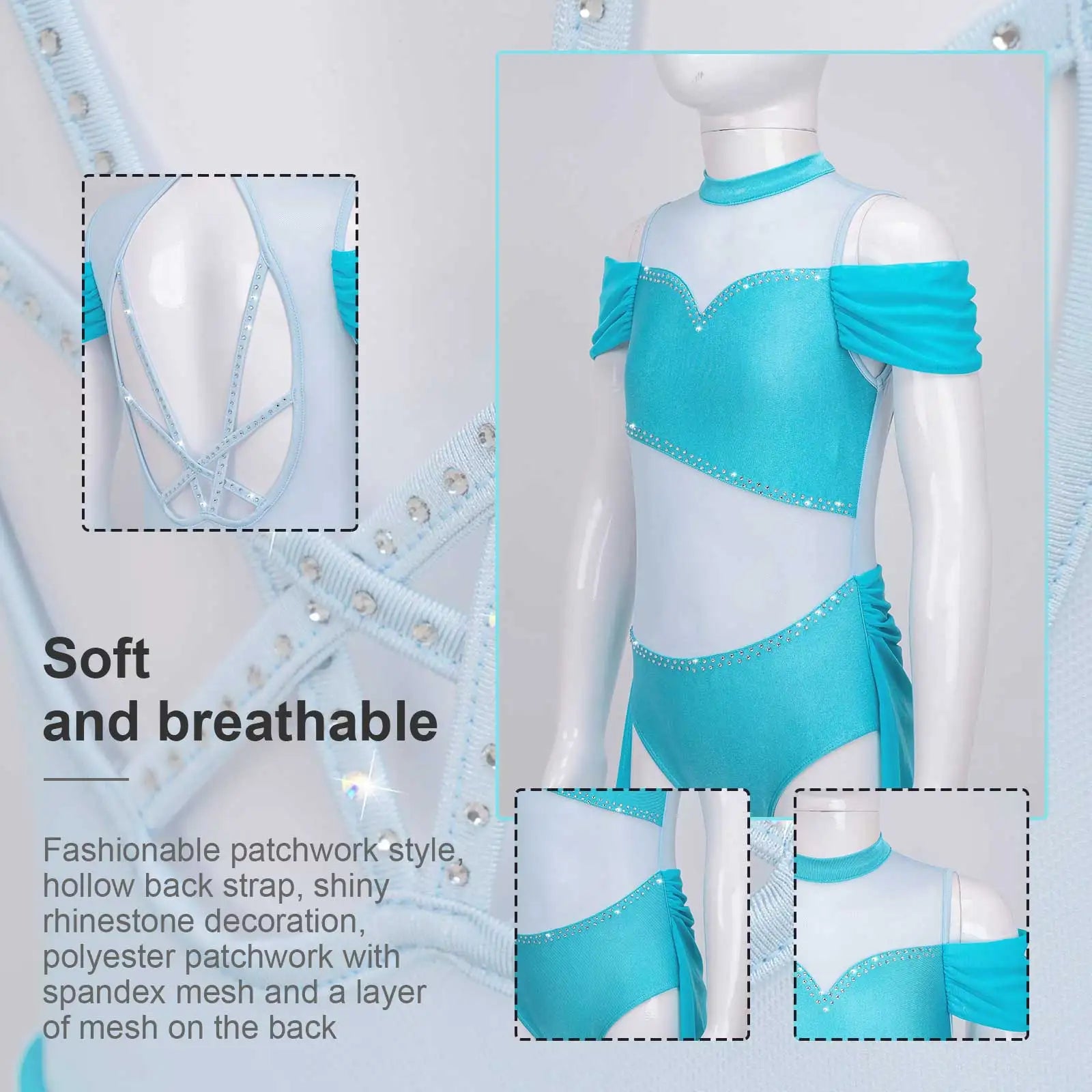 The dance leotards features with sleeveless and round neckline, off-shoulder with elastic spandex mesh band design of the arm.
