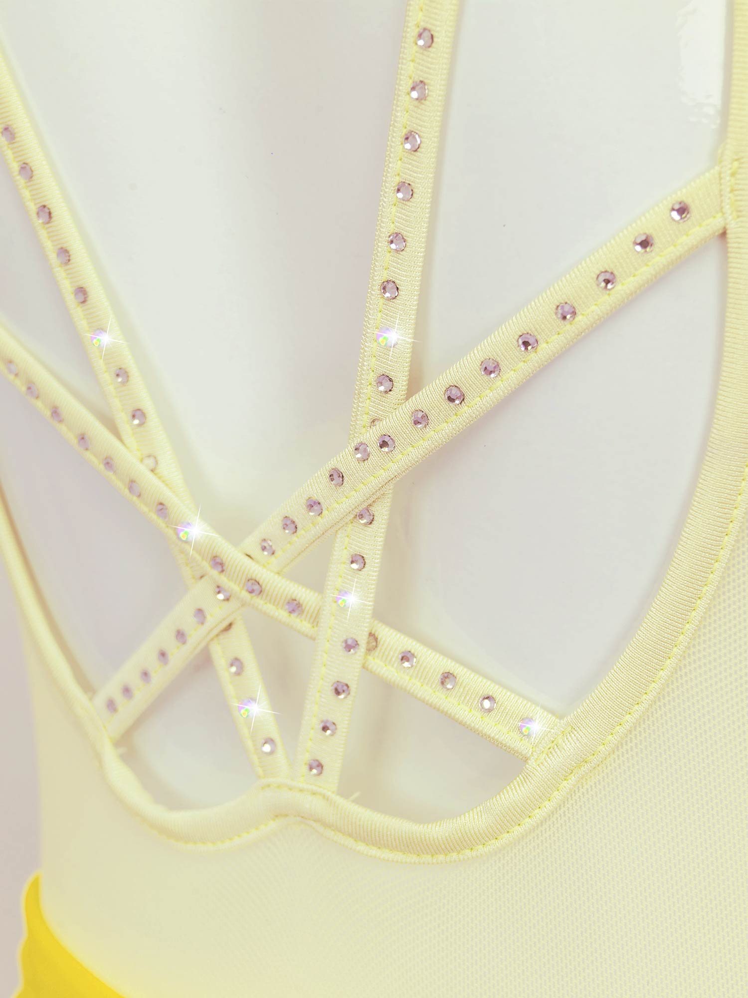 Fashion patchwork style, straps hollow back, shiny rhinestone decorated, polyester patchwork with spandex mesh, a layer mesh at back.