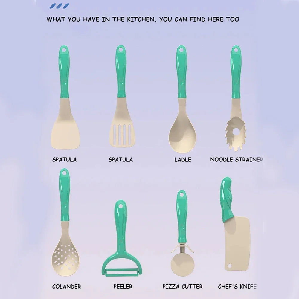 1. Complete Toy Kit -This pretend cooking sets include pots and pans, plates and dishes, kettle, spoon, shovel, fork, cutting board, fake food like fruits and vegetables/egg/fast foods etc. Great cute addition for any play kitchen.