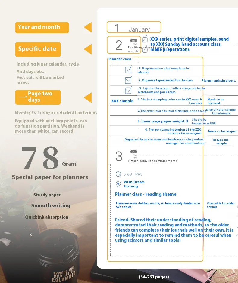 5. Detail/Technology ,can be written flat at 180°, high-quality writing experience, efficient & cute life planning technique; soft PU cover, increase the touch, and the overall exquisite book is more obvious with the hot stamping process