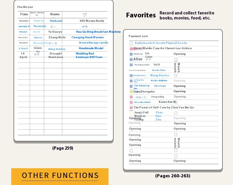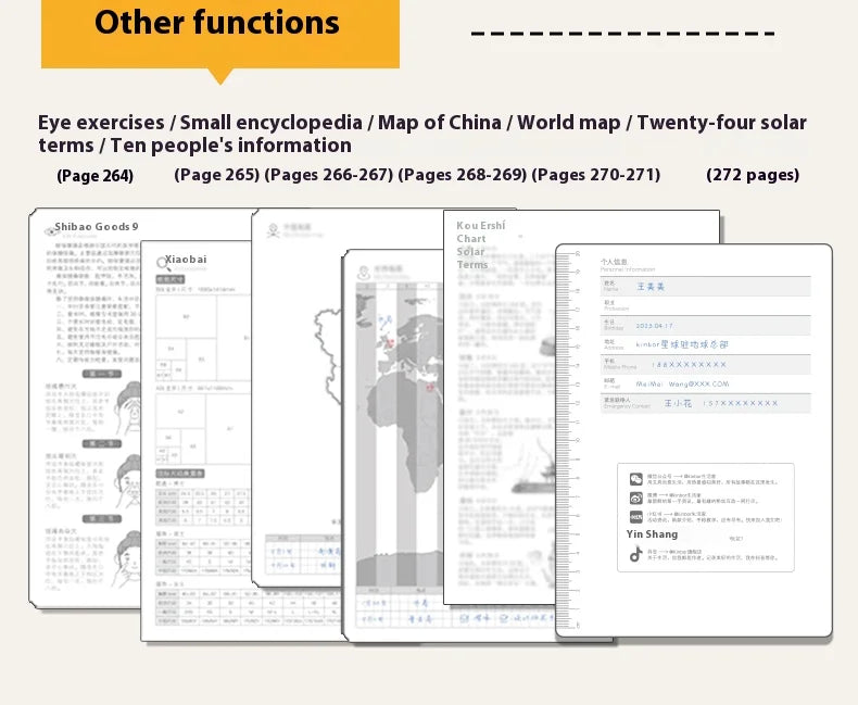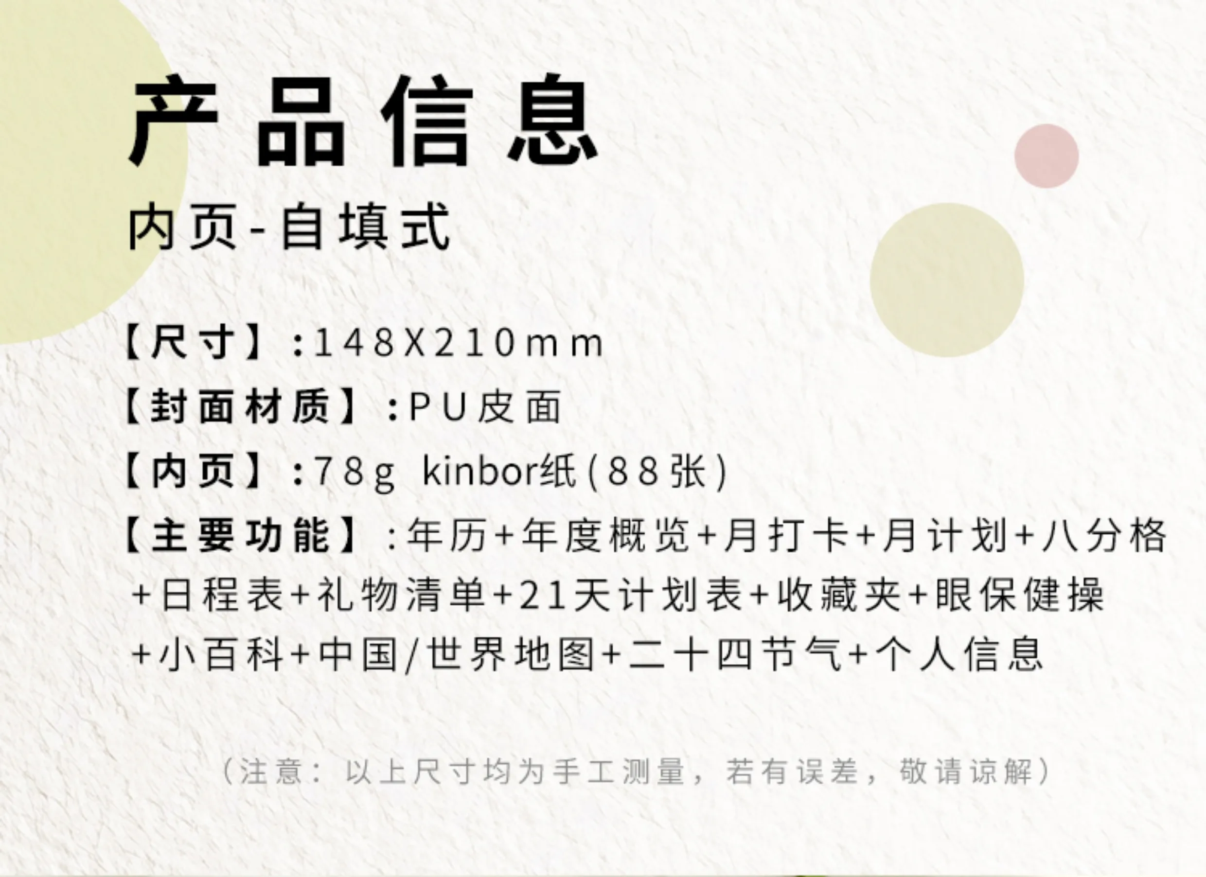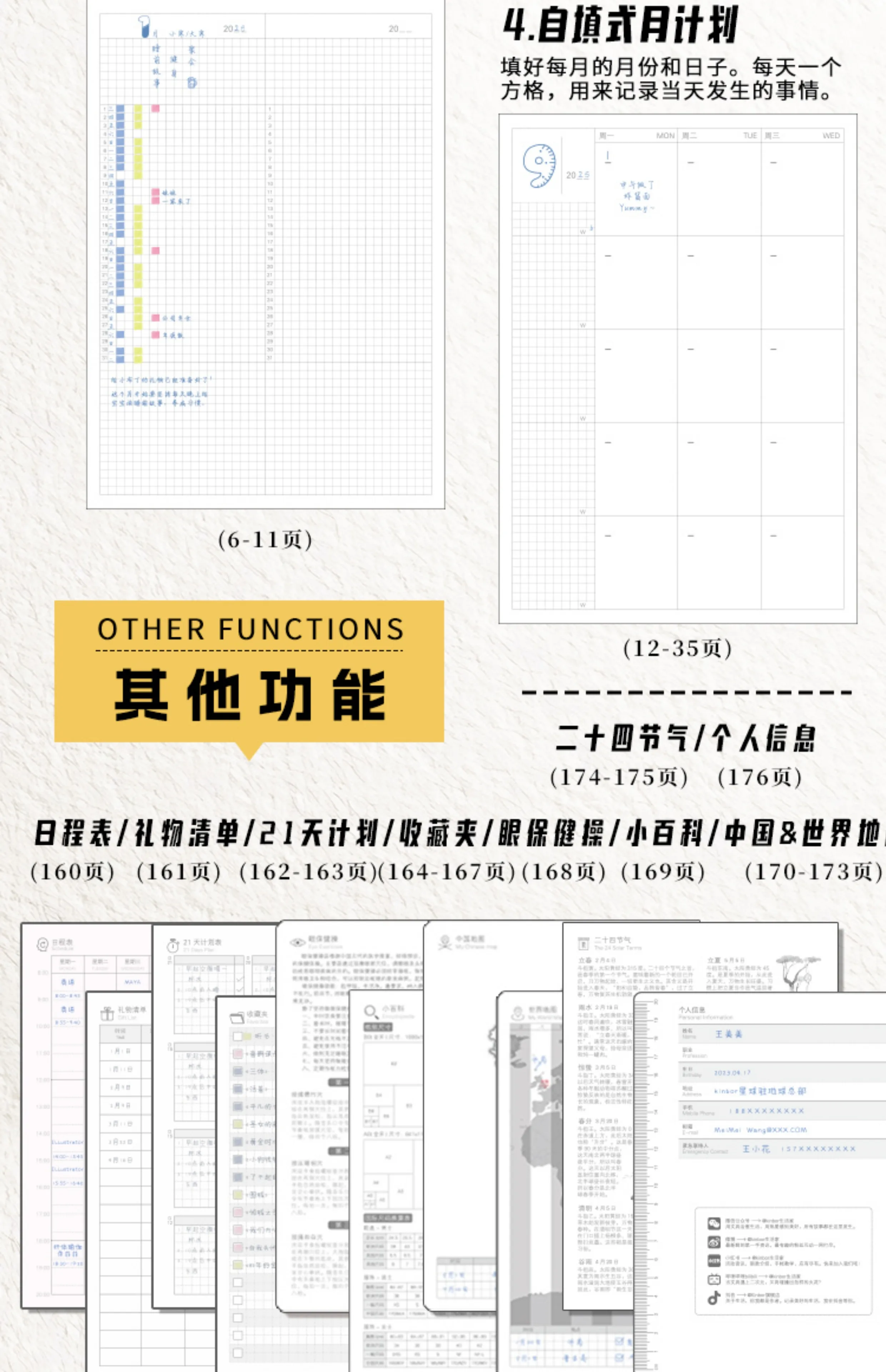 [Main Function]: Calendar+Annual Overview+Monthly Check-in+Monthly Plan+Octagon+Schedule+Gift List+21-Day Plan+Collection Sheet+Eye Exises+Mini Encyclopedia+China/World Map+Twenty-Four Solar Terms+Personal Information