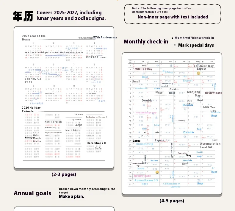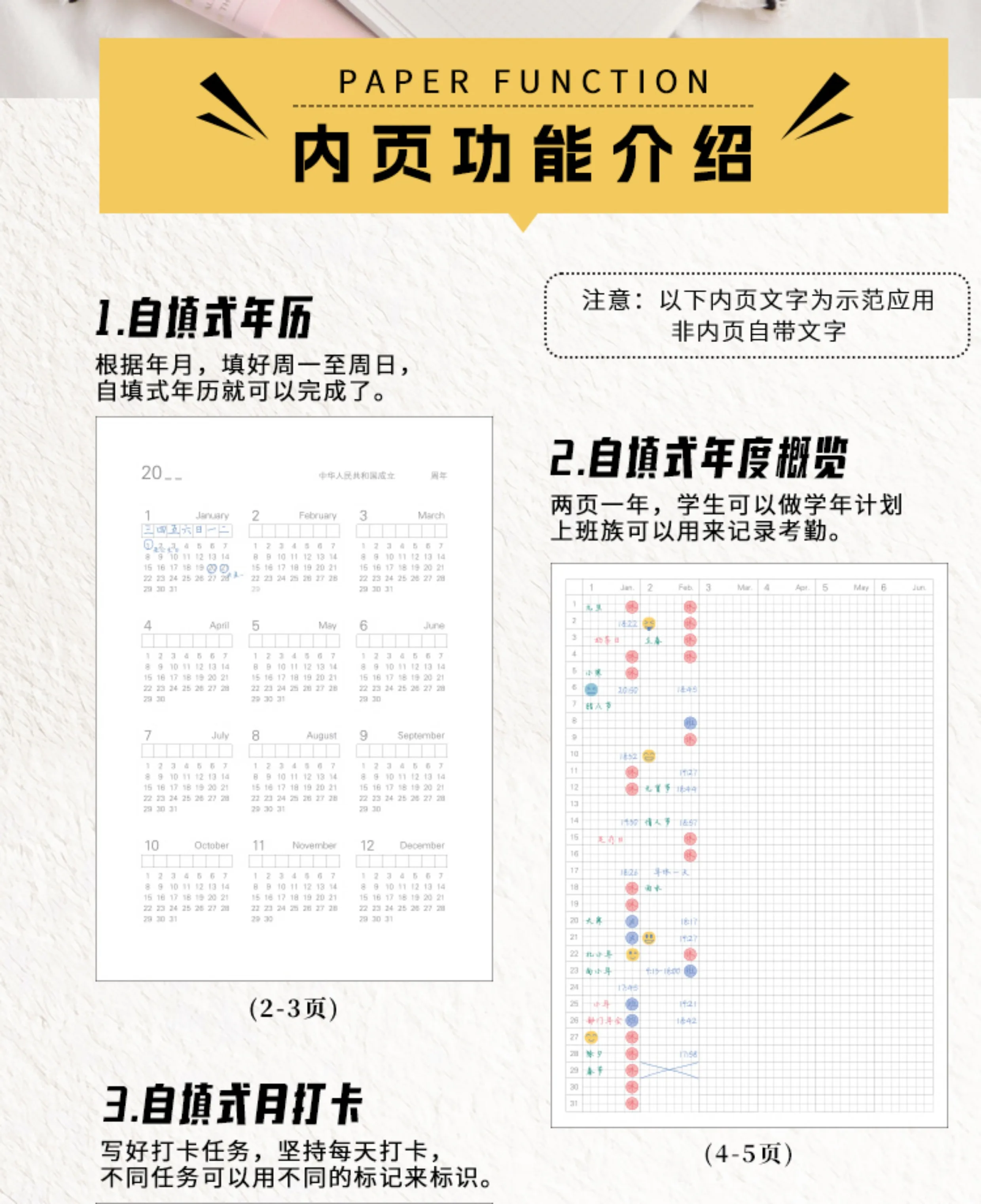 3. Monthly check-in: Efficiency check-in every month, mark special days4. Annual goals: Break down the goals into monthly plans according to the goals