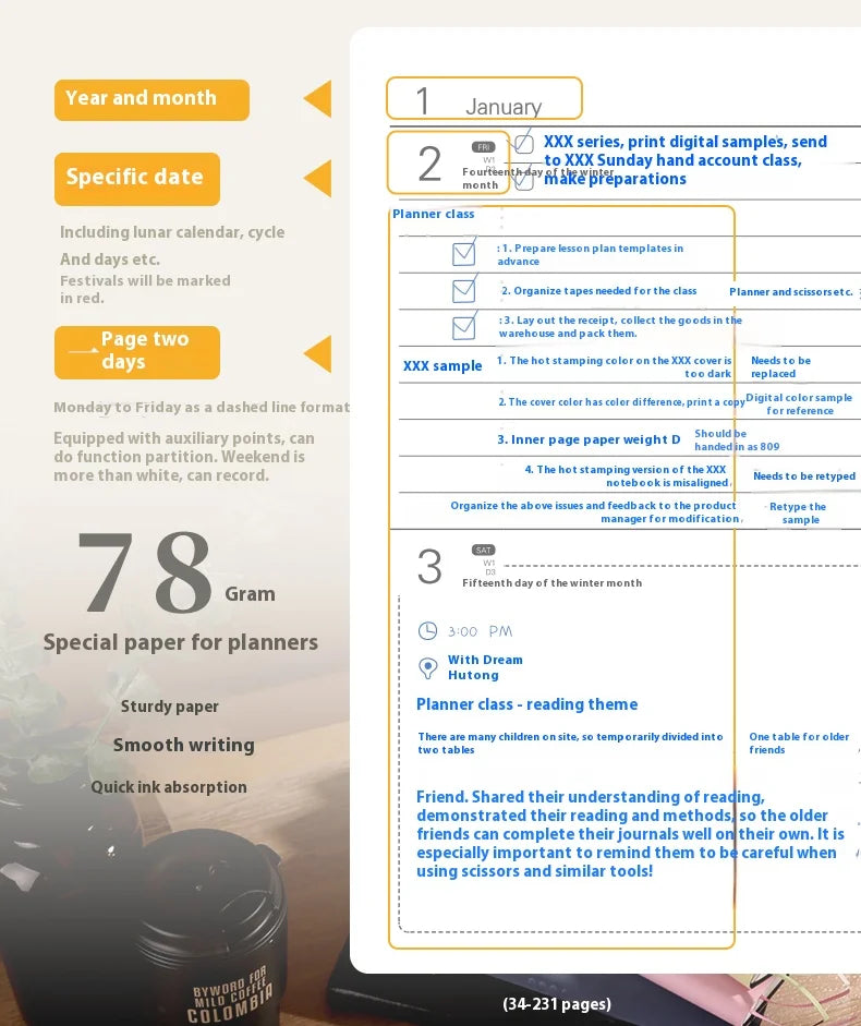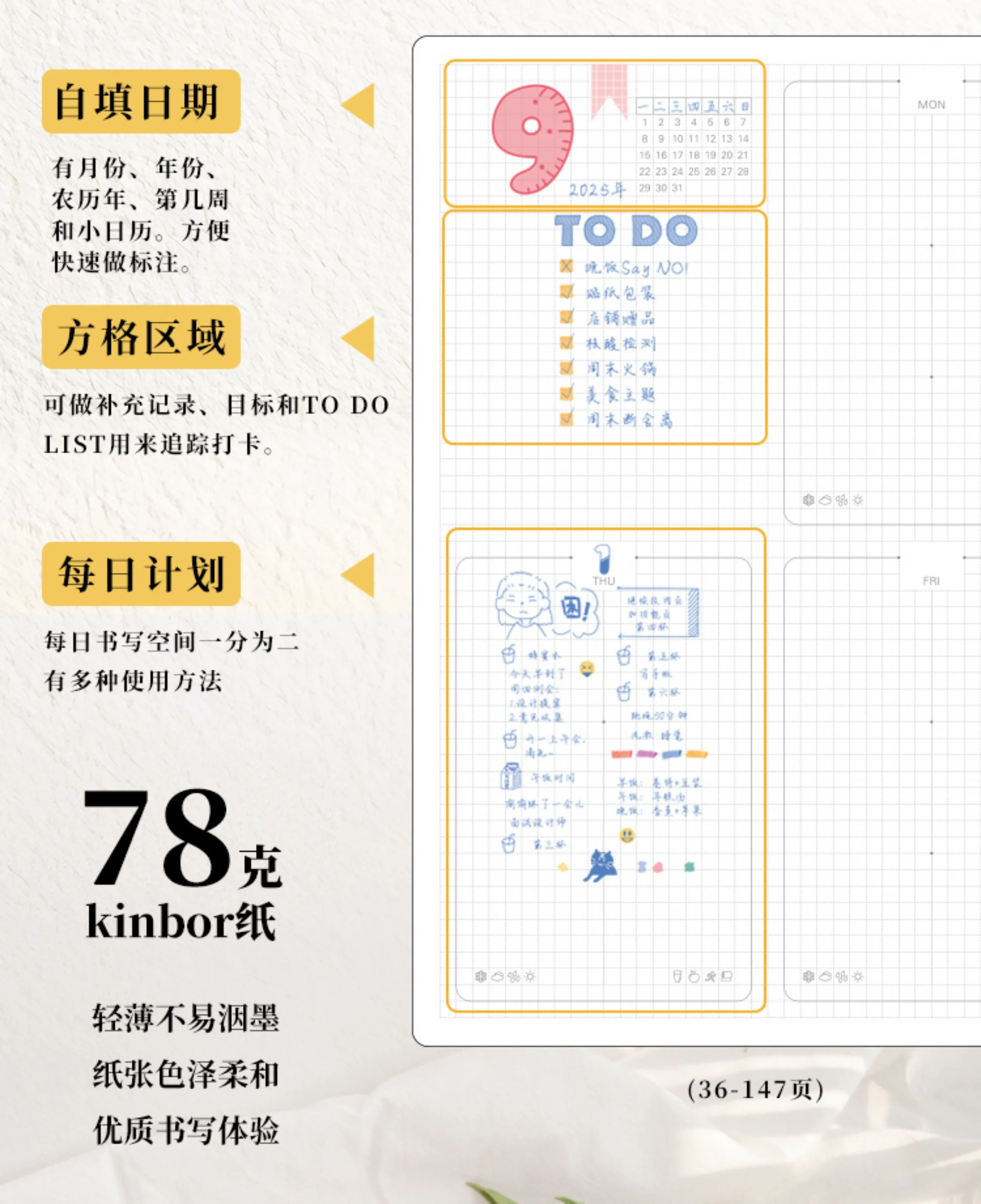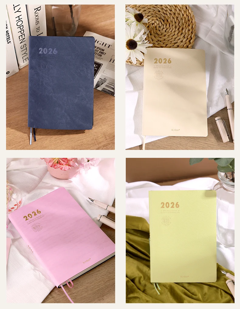 3. Self-filling dates, with months, years, lunar year, which week and a small calendar, convenient quick annotations; grid area, can be used for stock record, goals and TO DO LIST to track check-ins; daily plan, daily writing space divided into two, with variety of usage methods; 78g Kinbor paper, thin and light, not easy to feather, paper color soft and high-quality writing experience;