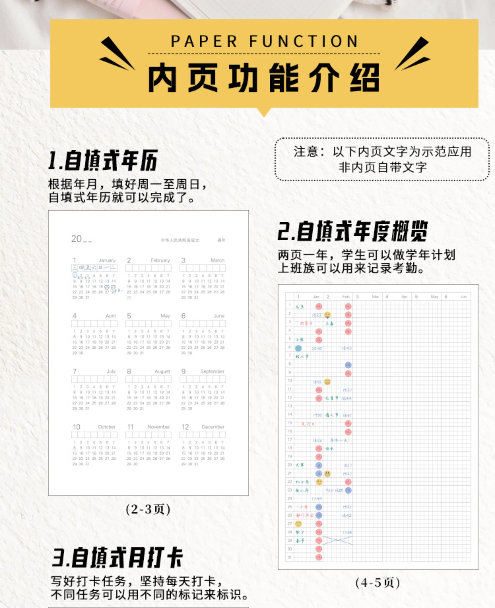 4. Introduction the functions of the inner pages, (1) self-filling calendar, according to the year and month, fill in the Monday to Sunday, and the self-filling calendar is; (2) self-filling annual overview, two pages a year, students can make a school year plan, and office workers can use it to record attendance; (3)-filling monthly plan, write down the check-in task, insist on checking in every day, and different tasks can be identified with different marks; (4) self-filling plan, fill in the month and day of each month, one grid per day, to record the events of the day; (5) other functions, 24 solar termspersonal information/schedule/gift list/21-day plan/favorites/eye exercises/small encyclopedia/China & World Map