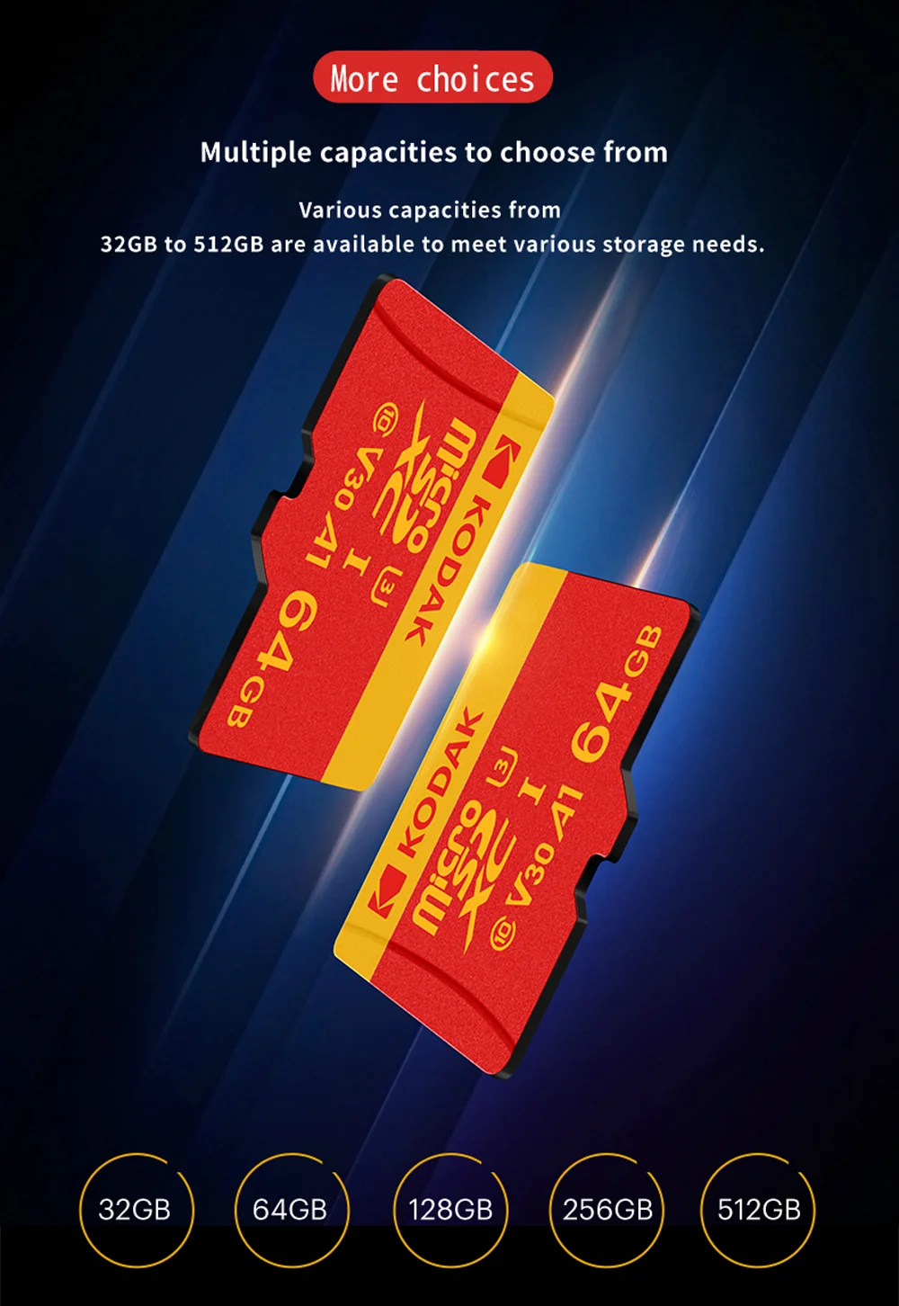 Kodak High Speed Micro SD Card U3 Class 10, up to 100MB/s, TF Memory Card with Adapter - Available in 32GB, 64GB, and 128GB