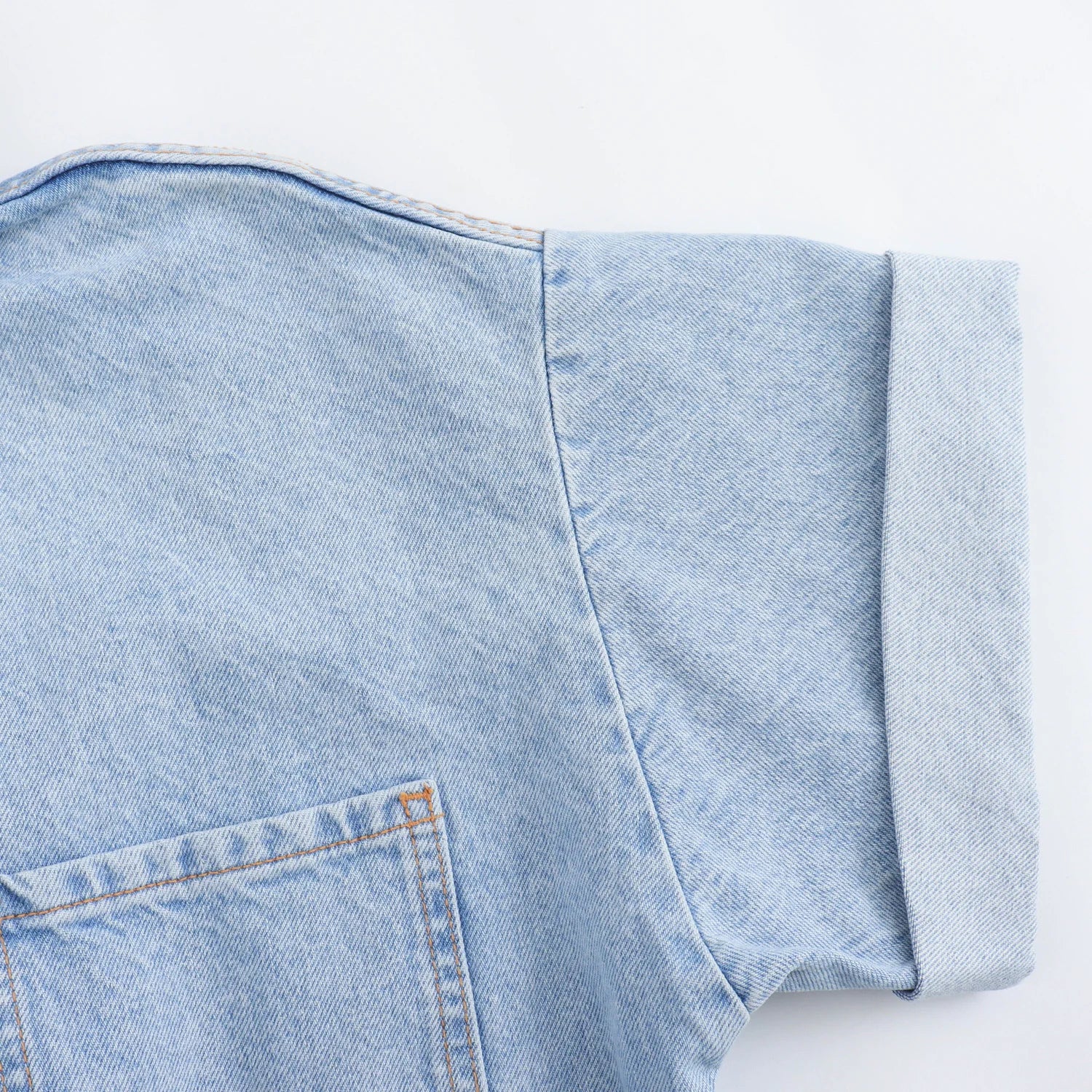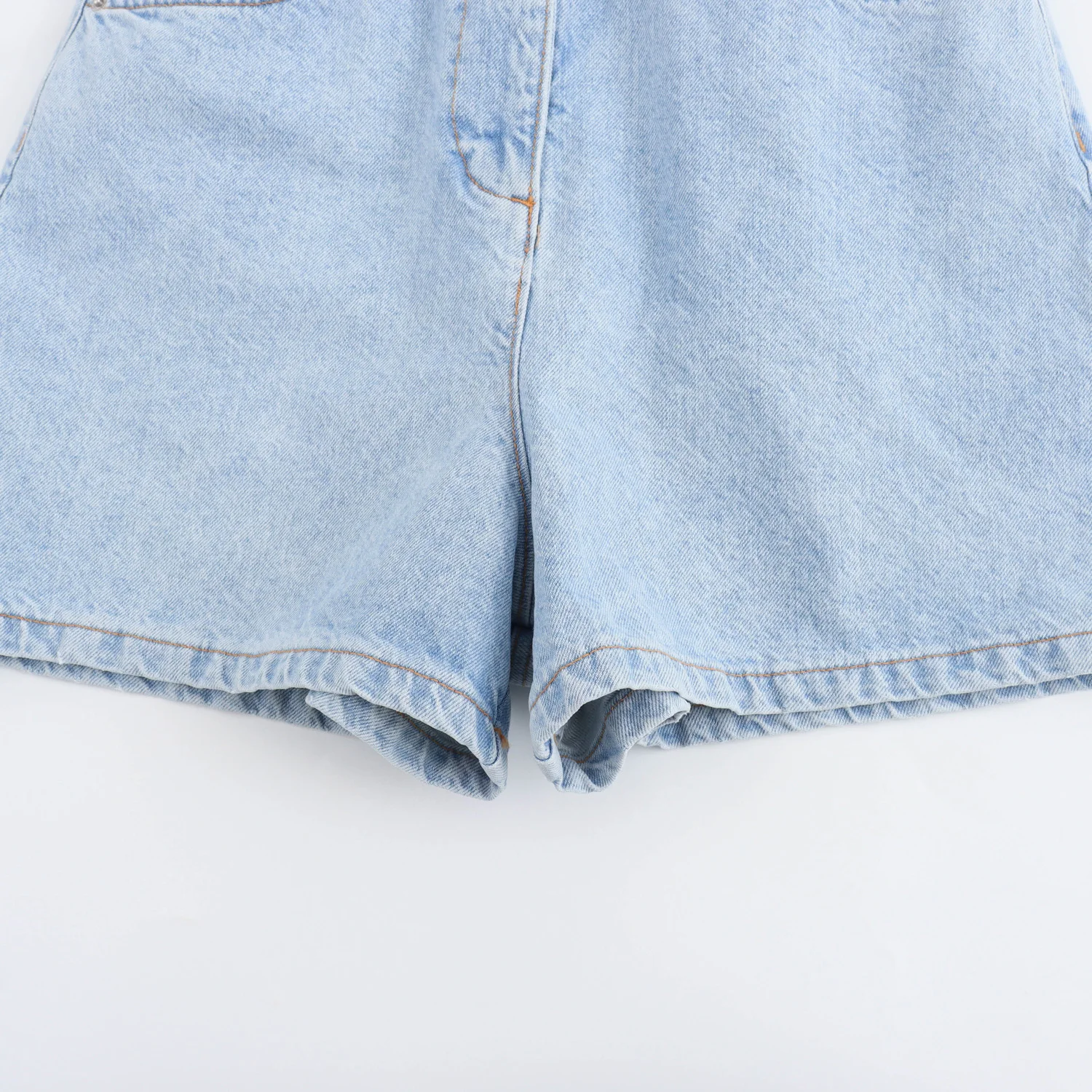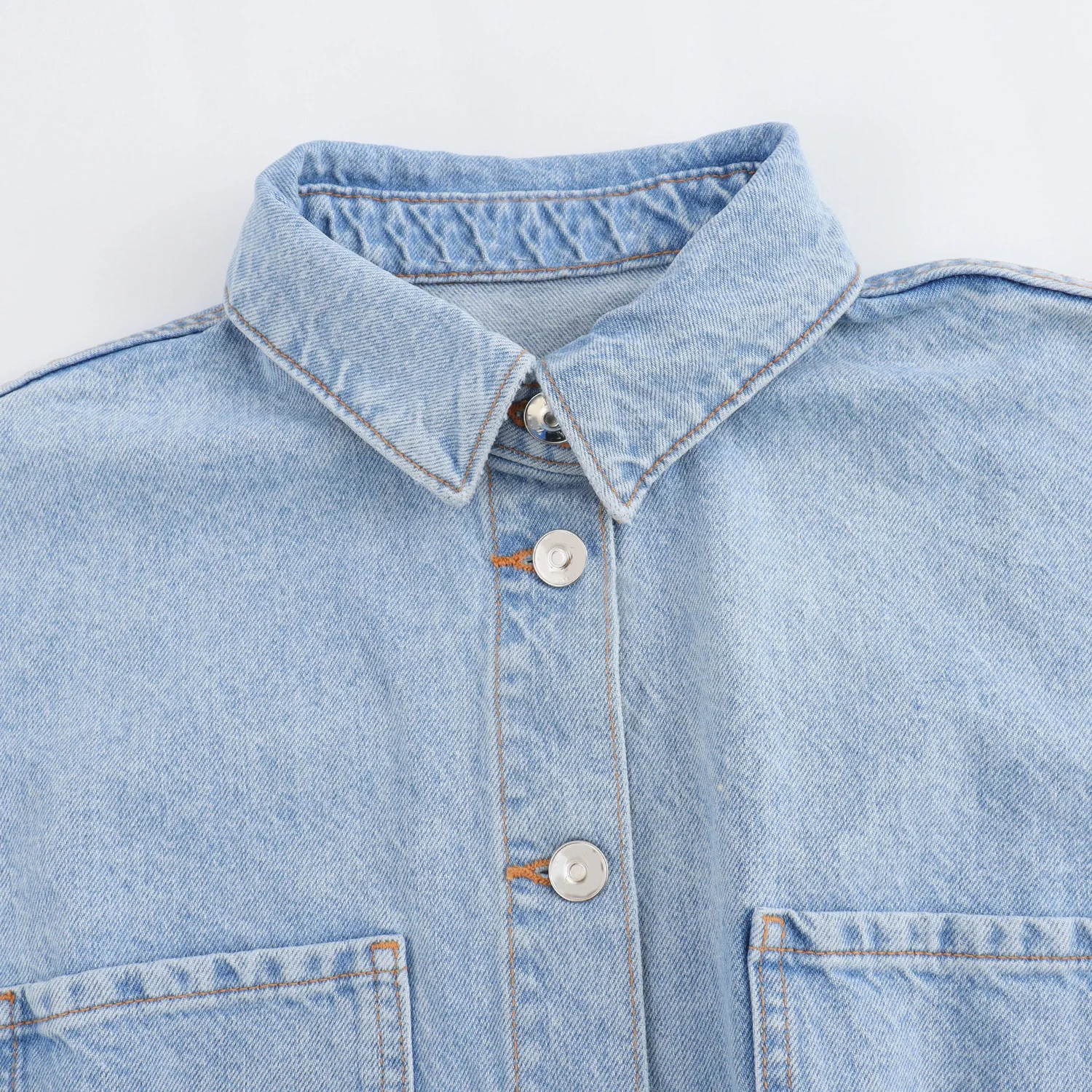 KP&ZA Vintage Summer Women's Casual Slim Denim Overalls Washed Technique Waist Solid 1879039 Rolled Sleeve Lapel Button