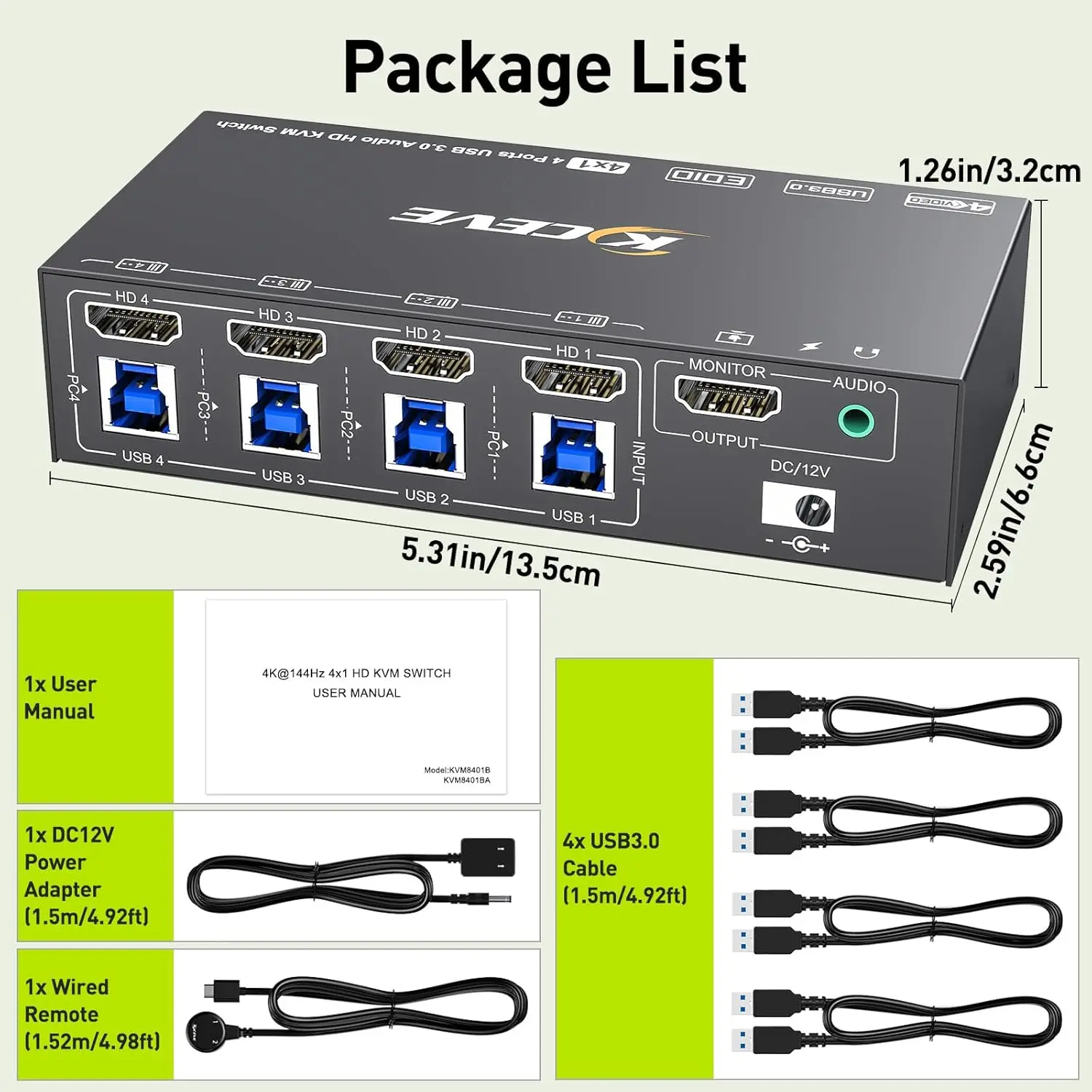 KVM Switch 4 Computers 8K@60Hz 4K@144Hz Simulation EDID USB3.0 Switcher for 4 Computers Share 1 Monitor and Share Keyboard Mou