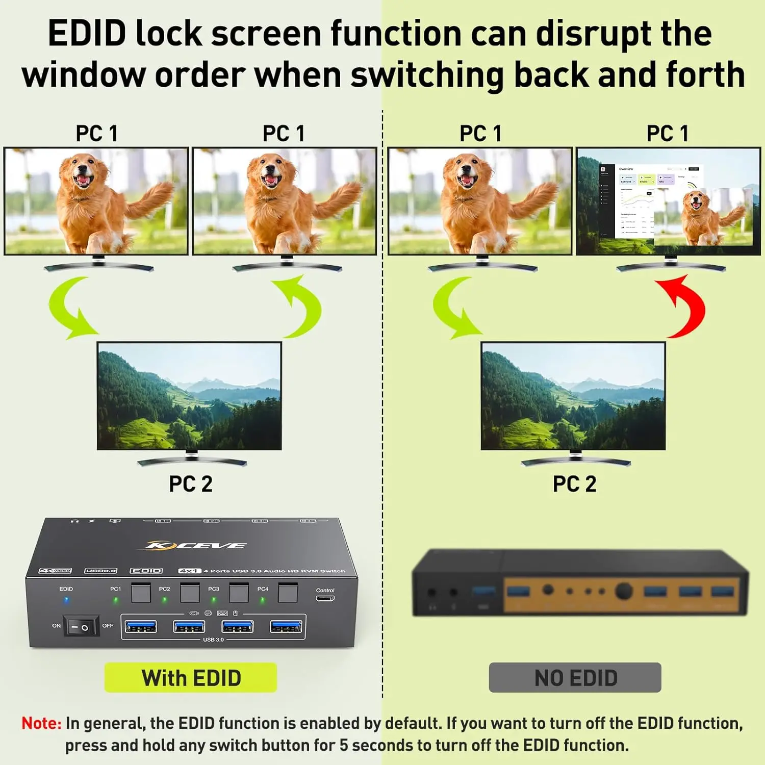 Optional EDID function: The EDID function of this USB 3.0 KVM Selector Box is optional. When you don't need it, you only need to press and hold one of the four switch buttons for 4-5 seconds to turn off the EDID function. If you want to turn on the EDID function, you also need to press and hold one of the four switch buttons for 4-5 seconds.