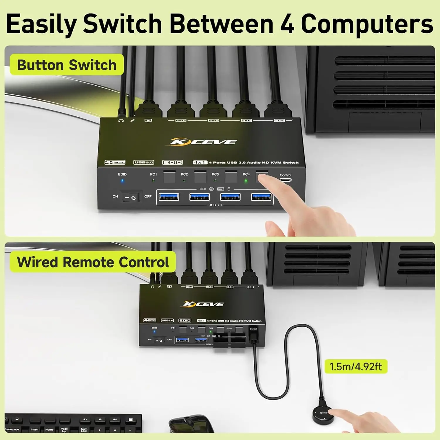 【KVM Switch 4 Ports】KVM Switch HDMI 4 Ports allows you to switch between 4 desktops/laptops. Use 1 set of keyboard and mouse to control 4 computers and 1 monitor without having to buy additional monitors, keyboards and mouse. KVM Switch 4 computer helps you tidy up your desk and improve office efficiency. HDMI KVM Switch 4 Ports is the first choice for offices and home work.