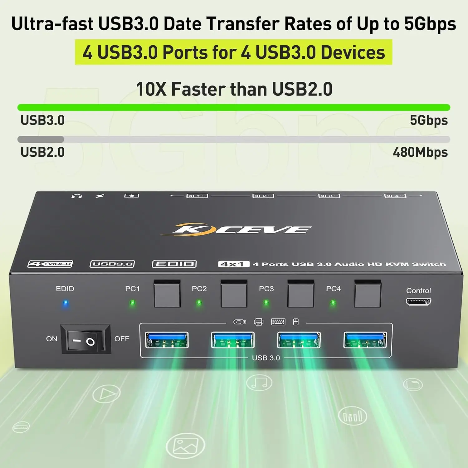 ✅【KVM Switch HDMI USB 3.0 up to 5Gbps】This 4 port HDMI USB Switch allows 4 computers to connect 1 monitor and 4 USB 3.0 devices. 4 ports USB3.0 KVM switch supports transfer rates up to 5Gbps, 10 times faster than USB2.0 480 Mbps. KVM Switch HDMI USB 3.0 can connect keyboard, mouse, printer, USB stick, scanner and other USB devices. This means you don't have to change cables every time you want to use a different device.