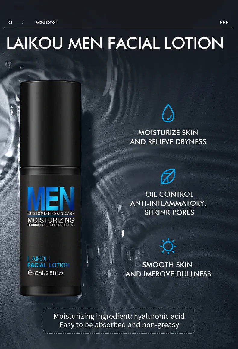LAIKOU Men Facial Lotion is enriched with Cladosiphon Okamuranus Extract, Niacinamide and other moisturizing ingredients, which is customized for healthy-looking skin. It can balance the skin secretion of water and oil, replenish skin moisture and prevent dry skin. It's suitable for all skin types.