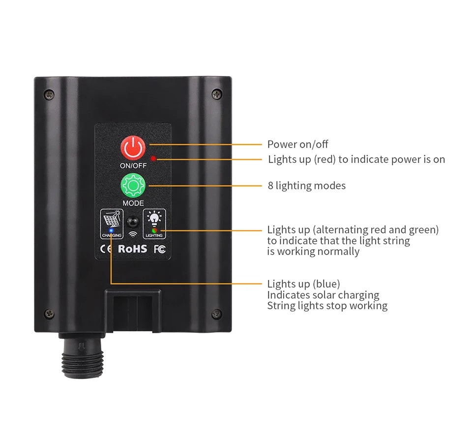 【Why Choose This Solar String Lights】: Longer Working Time, Super Bright 24V LED String Lights, IP65 Waterproof Performance, High Quality Flexible PC Wire, Quick Charging Technology.The new solar panel power is 4.5V/250mA, charging power is 3 times with other solar panel.