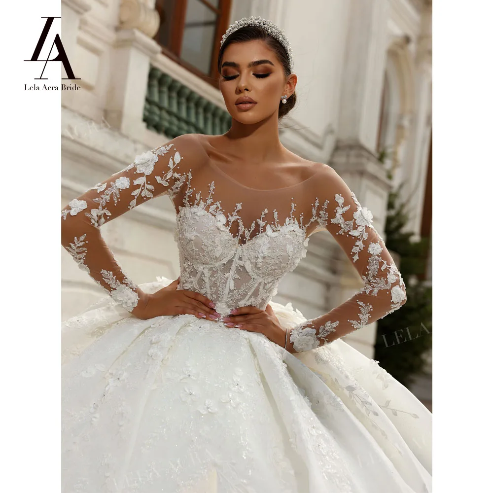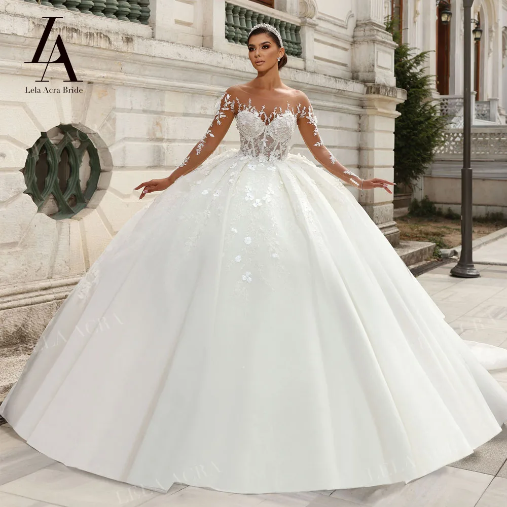 LelaAcra 3D Flowers Wedding Dress 2026 Long Sleeve Sweetheart Luxury Ball Gown Princess Bride SM161 Plus Size Vestido de Noiva