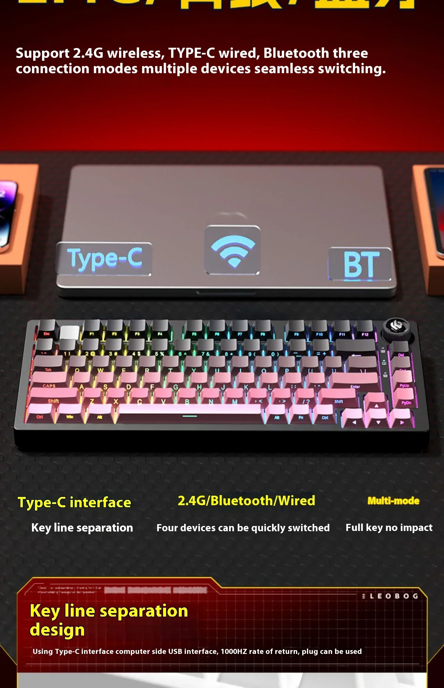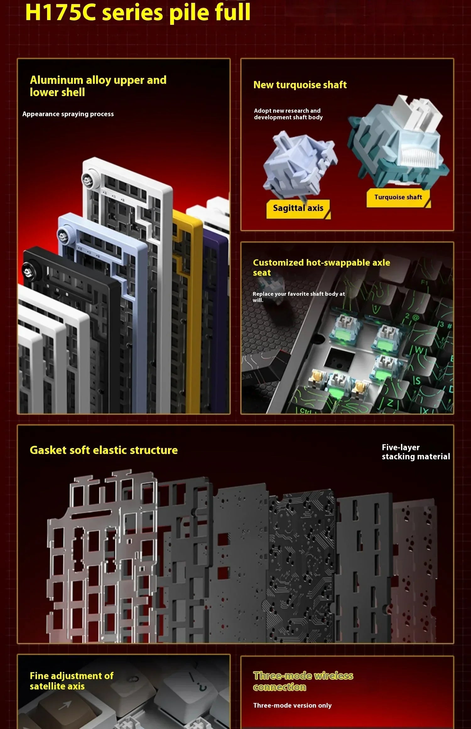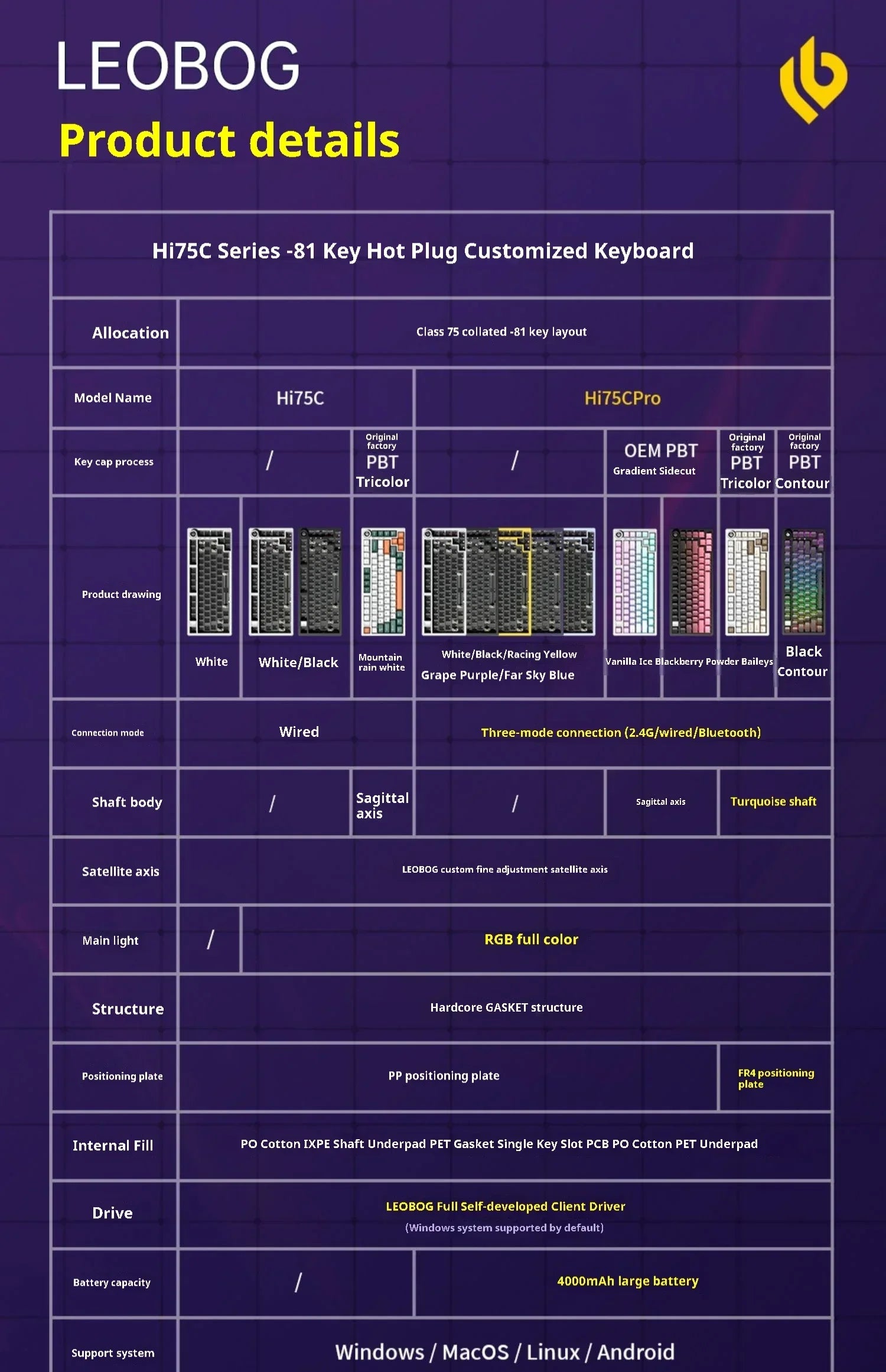 Hi75C Pro: Tri-mode connection (2.4G / wired / Bluetooth); keycap craftsmanship includes OEM PBT gradient side engraving, original PBT three-color, original PBT contour line; axis body includes Star Arrow axis, turquoise axis; RGB full-color main light; FR4 positioning plate; 4000mAh large battery.