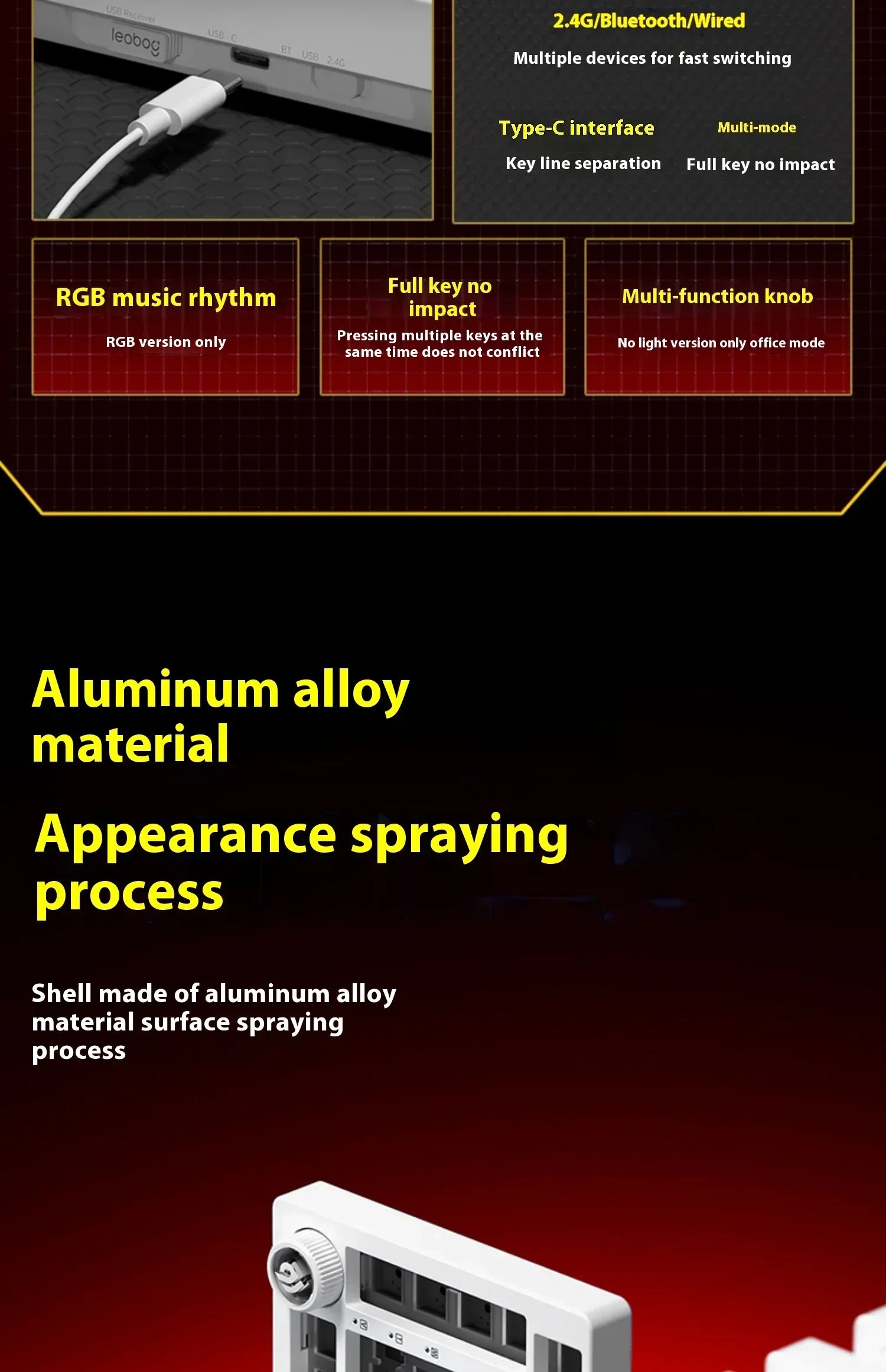 Hi75C: Wired connection; keycap craftsmanship is original PBT three-color; axis body is Star Arrow axis; no main light; PP positioning plate; no battery capacity data.