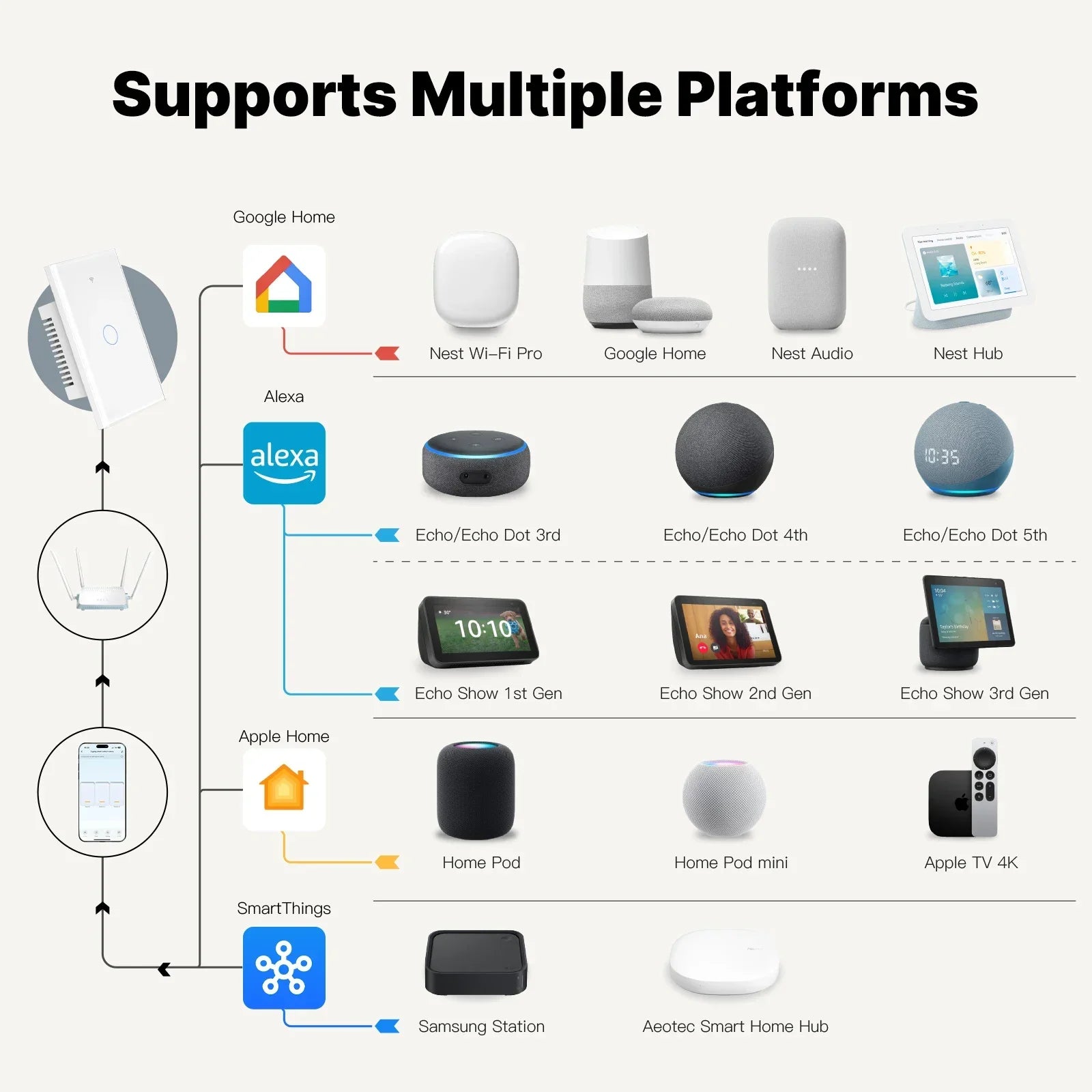 The Matter protocol integrates different smart home platforms into smart products that support the Matter protocol. This means that Matter smart plug can be controlled on multiple platforms and can be linked with devices on different platforms.