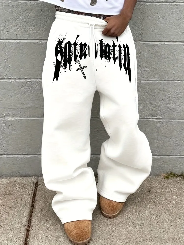 Men's Black Wide Leg Pants, French Graffiti and Cross Print, Hip Hop Fashion Streetwear Trousers, Oversized Casual Joggers 2025