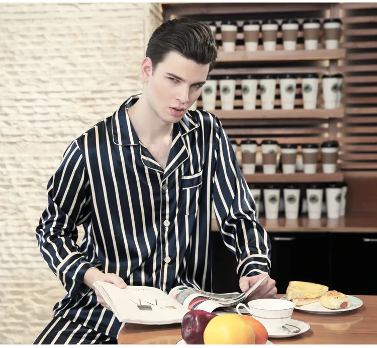 Men's Modern Style Striped Silk Satin Sleepwear Long-Sleeved Two-piece Suit Set Home Clothes All Seasons Leisure Nightwear J055