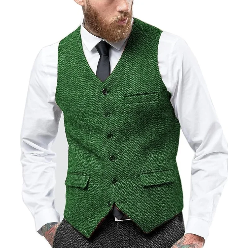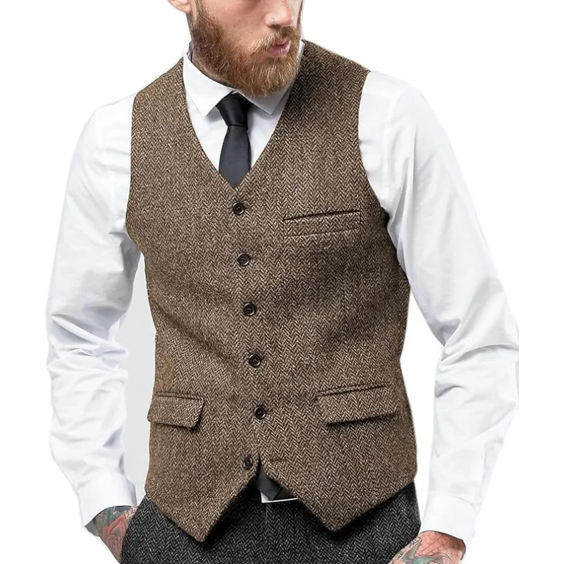 Men's Vintage Herringbone Vest | Slim Fit Wool Tweed Waistcoat for Prom/Wedding (Classic Retro Style) Herringbone Weave