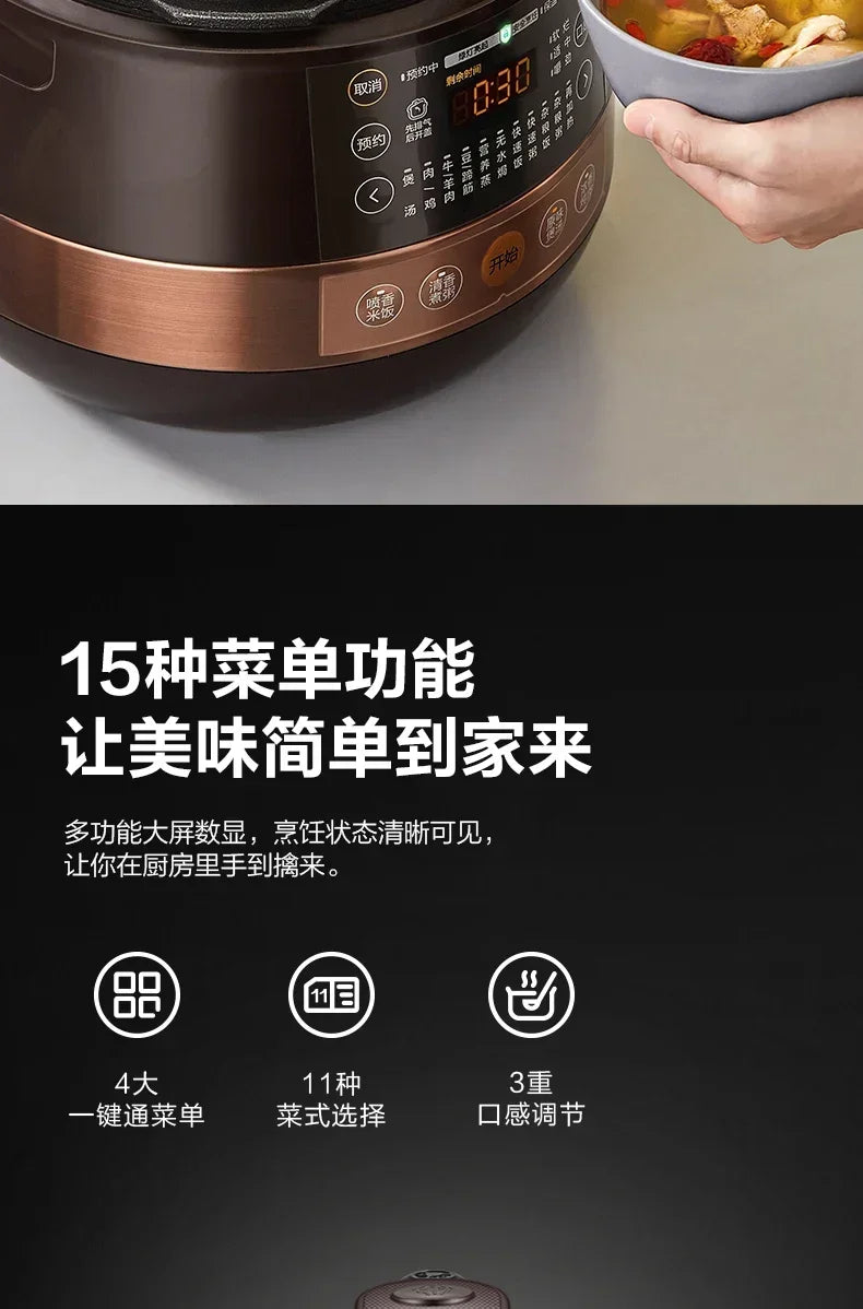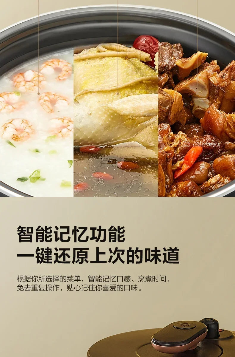 Function: Non-Stick Coating Inner Pot,Claypot Cooked Food,Reservation,Rice Cooking,Non-water Non-oil Fricassee & Lobscouse,Rice Cooking & Porridge Cooking & Soup Stewing,Cooking & Stewing & Heating,Quick Boiling,Reheating,Fine Cook