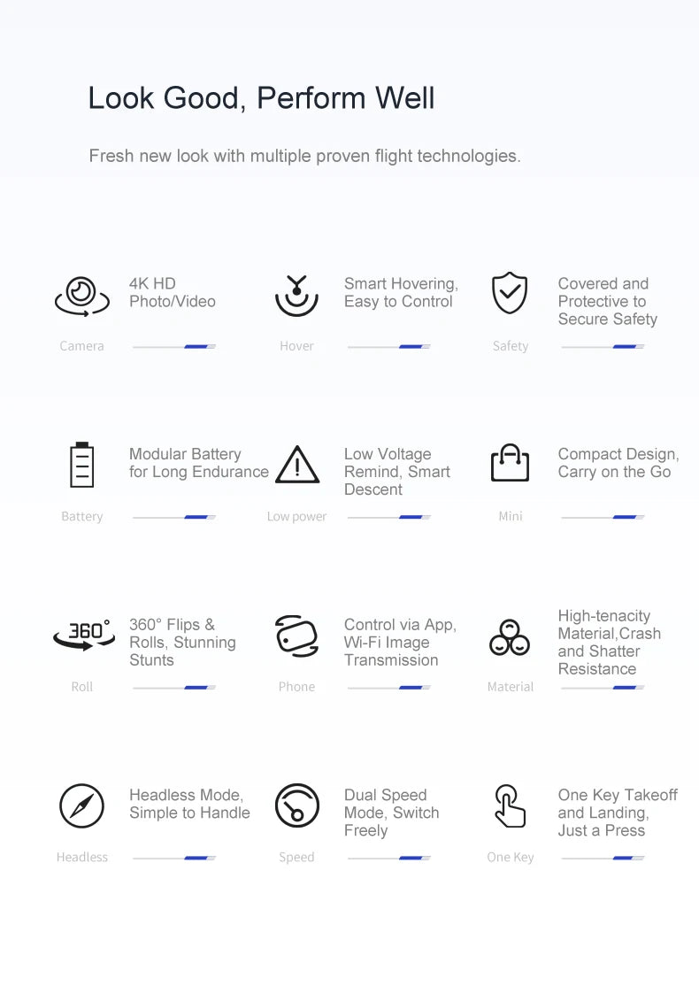 Standard version: 1. Module battery 2. Low light prompt 3. Mobile phone control, 4. Up/Down/Forward/Back/Left/Right/Left 5. Fast/Slow switching 6. Headless mode 7. 360 degree roll 8. One button start/landing