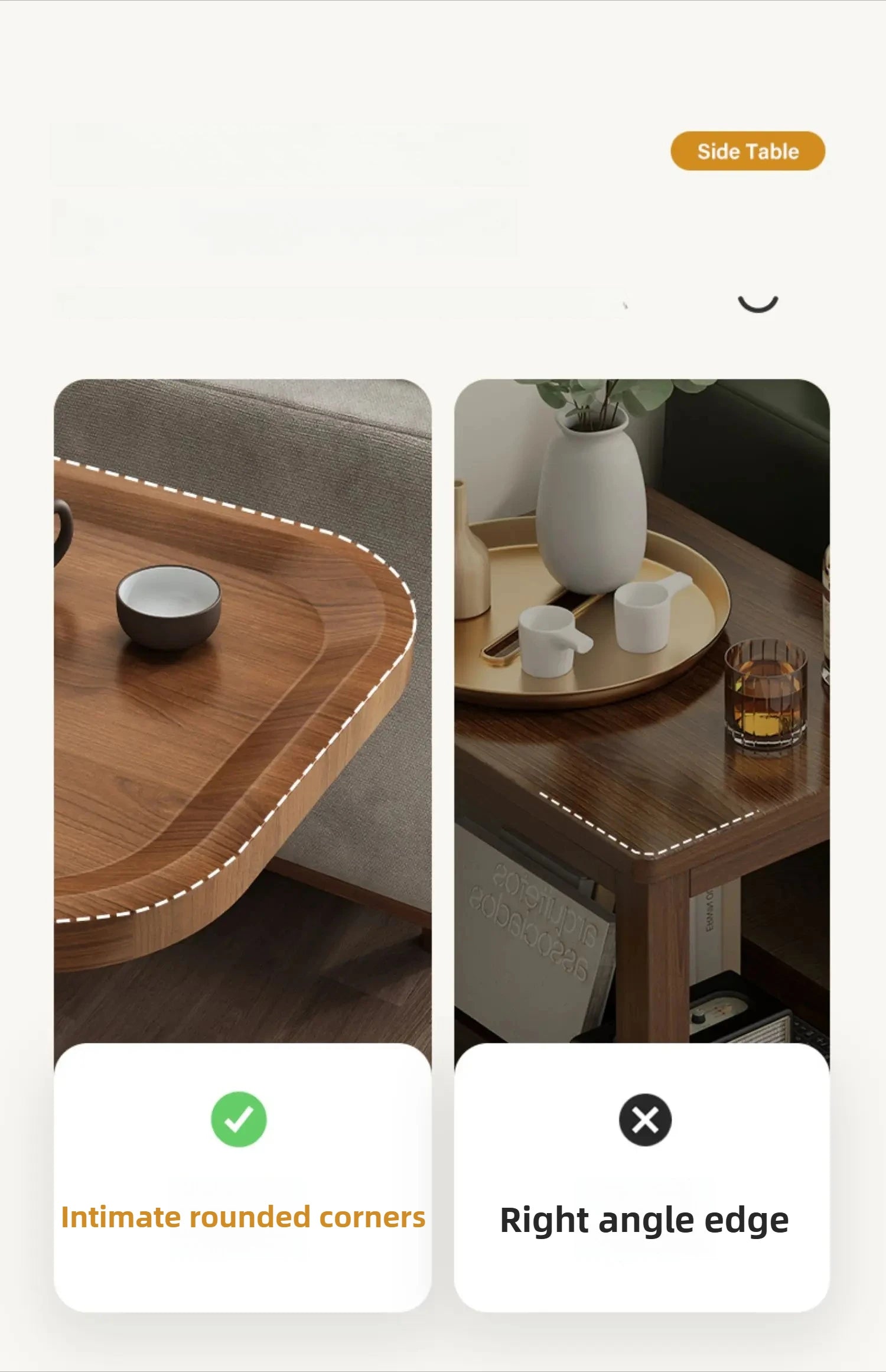 C-Support Frame Structure: Features a C-shaped frame that fits snugly next to sofas or beds, saving space while offering ample surface area.