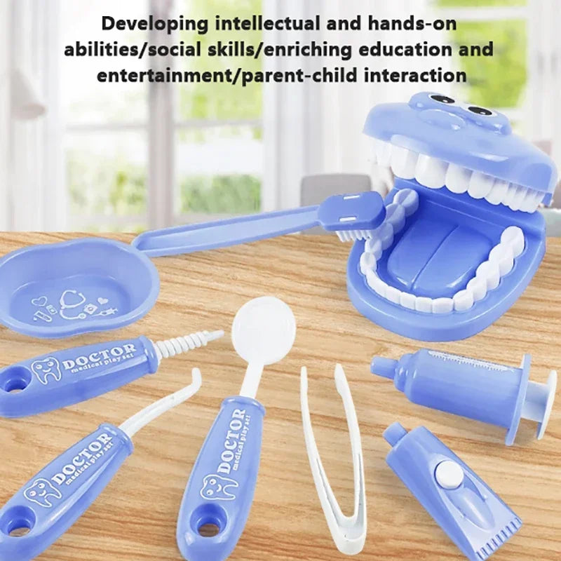 9PCS dental toys (1PCS dental hooks, 1PCS dental mirrors, 1PCS toothpaste, 1PCS syringes, 1PCS dental drills, 1PCS tweezers, 1PCS toothbrushes, 1PCS plates, 1PCS dental molds)